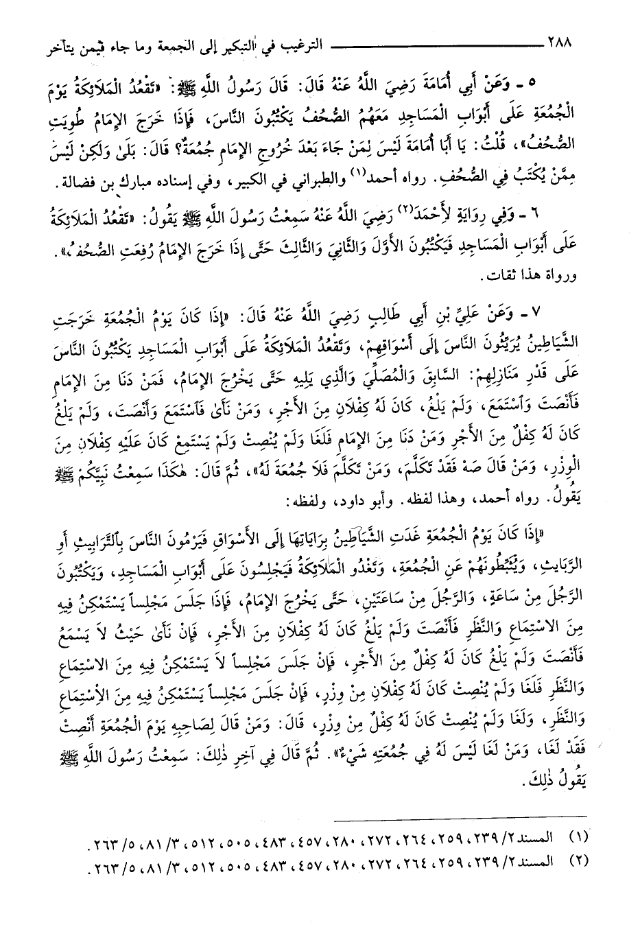 1064 - وَفِي رِوَايَة لاحمد رَضِي الله عَنهُ سَمِعت رَسُول الله صلى الله عَلَيْهِ وَسلم يَقُول تقعد الْمَلَائِكَة على أَبْوَاب الْمَسَاجِد فيكتبون الأول وَالثَّانِي وَالثَّالِث حَتَّى إِذا خرج الإِمَام رفعت الصُّحُف
