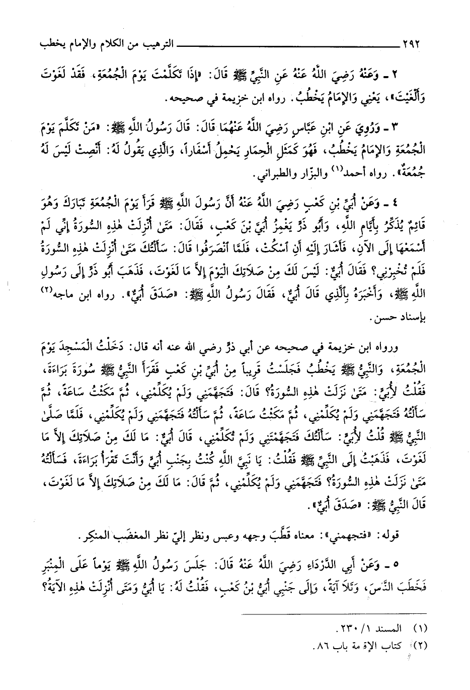 وَرَوَاهُ ابْن خُزَيْمَة فِي صَحِيحه عَن أبي ذَر رَضِي الله عَنهُ أَنه قَالَ دخلت الْمَسْجِد يَوْم الْجُمُعَة وَالنَّبِيّ صلى الله عَلَيْهِ وَسلم يخْطب فَجَلَست قَرِيبا من أبي بن كَعْب فَقَرَأَ النَّبِي صلى الله عَلَيْهِ وَسلم سُورَة بَرَاءَة فَقلت لابي مَتى نزلت هَذِه السُّورَة قَالَ فتجهمني وَلم يكلمني ثمَّ مكثت سَاعَة ثمَّ سَأَلته فتجهمني وَلم يكلمني ثمَّ مكثت سَاعَة ثمَّ سَأَلته فتجهمني وَلم يكلمني فَلَمَّا صلى النَّبِي صلى الله عَلَيْهِ وَسلم قلت لابي سَأَلتك فتجهمتني وَلم تكلمني قَالَ أبي مَا لَك من صَلَاتك إِلَّا مَا لغوت فَذَهَبت إِلَى النَّبِي صلى الله عَلَيْهِ وَسلم فَقلت يَا نَبِي الله كنت بِجنب أبي وَأَنت تقْرَأ بَرَاءَة فَسَأَلته مَتى نزلت هَذِه السُّورَة فتجهمني وَلم يكلمني ثمَّ قَالَ مَا لَك من صَلَاتك إِلَّا مَا لغوت قَالَ النَّبِي صلى الله عَلَيْهِ وَسلم صدق أبي