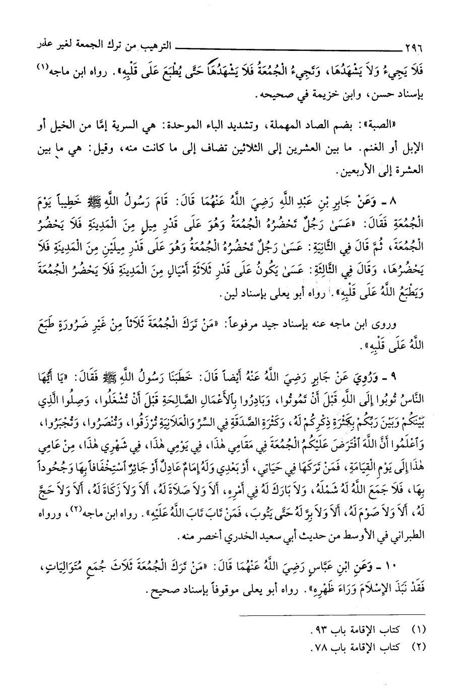 وروى ابْن مَاجَه عَنهُ بِإِسْنَاد جيد مَرْفُوعا من ترك الْجُمُعَة ثَلَاثًا من غير ضَرُورَة طبع الله على قلبه