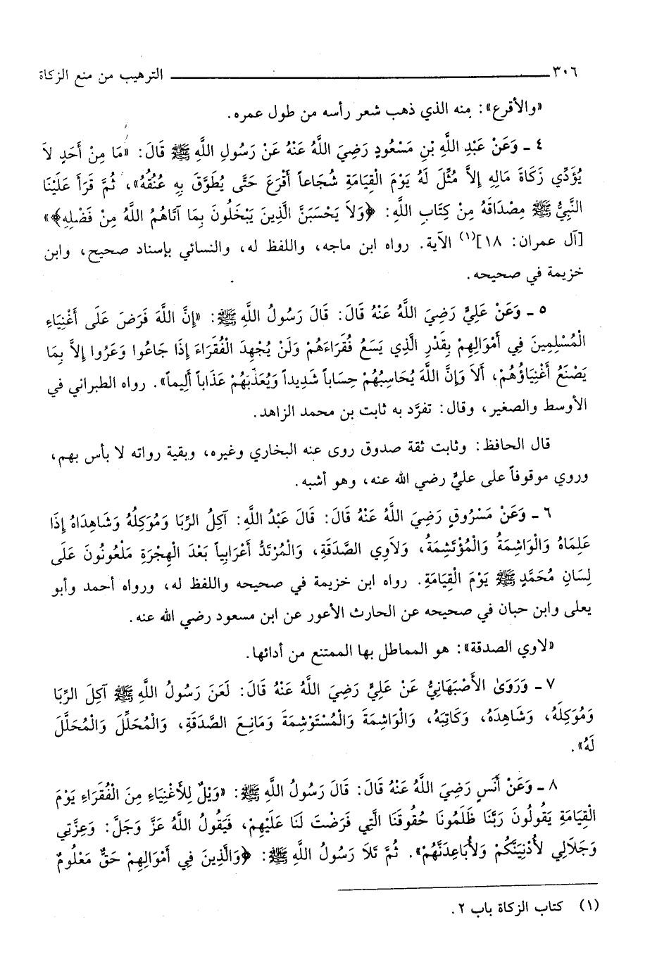 1129 - وَعَن عبد الله بن مَسْعُود رَضِي الله عَنهُ عَن رَسُول الله صلى الله عَلَيْهِ وَسلم قَالَ مَا من أحد لَا يُؤَدِّي زَكَاة مَاله إِلَّا مثل لَهُ يَوْم الْقِيَامَة شجاعا أَقرع حَتَّى يطوق بِهِ عُنُقه ثمَّ قَرَأَ علينا النَّبِي صلى الله عَلَيْهِ وَسلم مصداقه من كتاب الله {وَلَا يَحسبن الَّذين يَبْخلُونَ بِمَا آتَاهُم الله من فَضله} آل عمرَان 81 الْآيَة