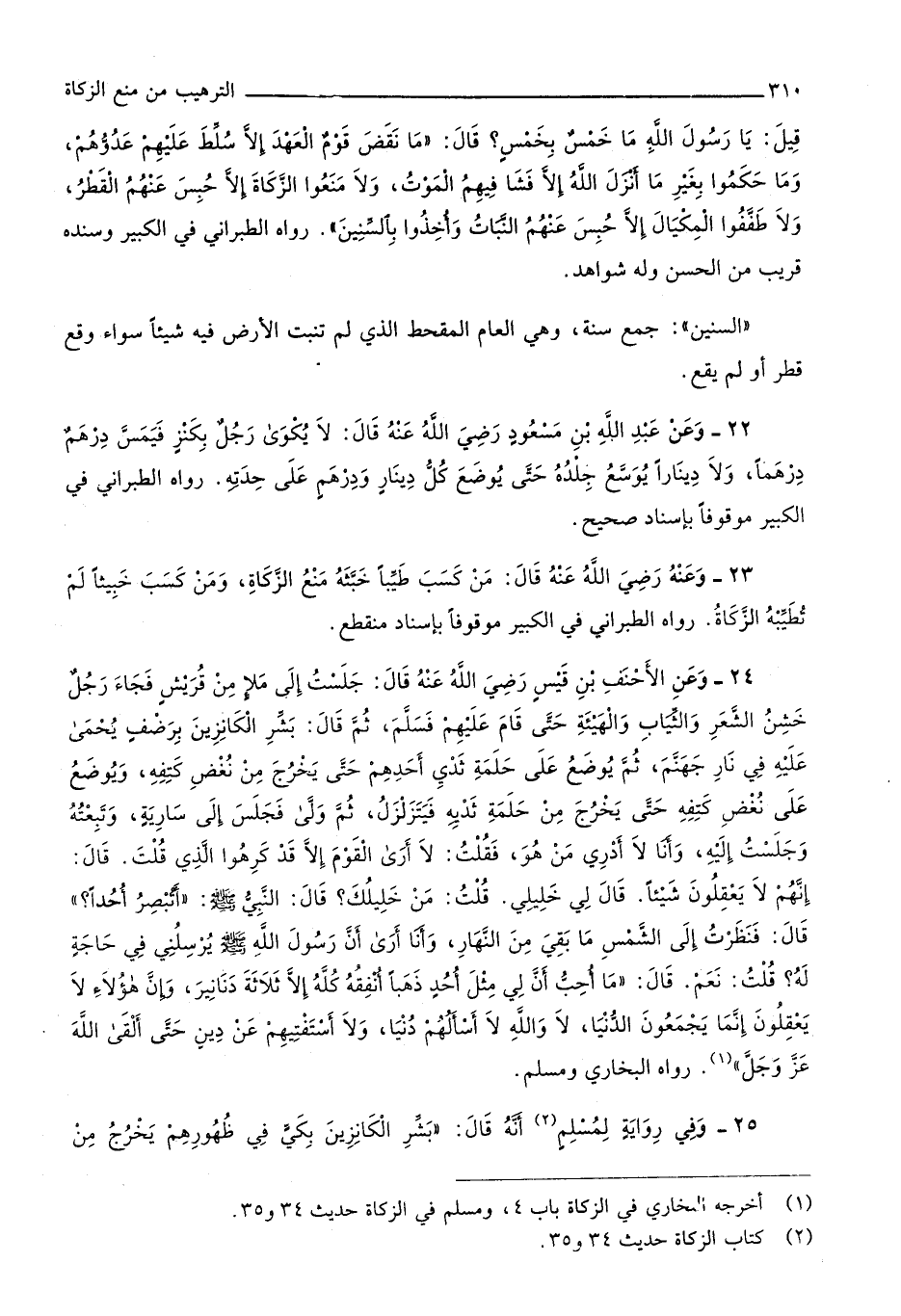 1149 - وَعَن الْأَحْنَف بن قيس رَضِي الله عَنهُ قَالَ جَلَست إِلَى ملإ من قُرَيْش فجَاء رجل خشن الشّعْر وَالثيَاب والهيئة حَتَّى قَامَ عَلَيْهِم فَسلم ثمَّ قَالَ بشر الكانزين برضف يحمى عَلَيْهِ فِي نَار جَهَنَّم ثمَّ يوضع على حلمة ثدي أحدهم حَتَّى يخرج من نغض كتفه وَيُوضَع على نغض كتفه حَتَّى يخرج من حلمة ثديه فيتزلزل ثمَّ ولى فَجَلَسَ إِلَى سَارِيَة وتبعته وَجَلَست إِلَيْهِ وَأَنا لَا أَدْرِي من هُوَ فَقلت لَا أرى الْقَوْم إِلَّا قد كَرهُوا الَّذِي قلت