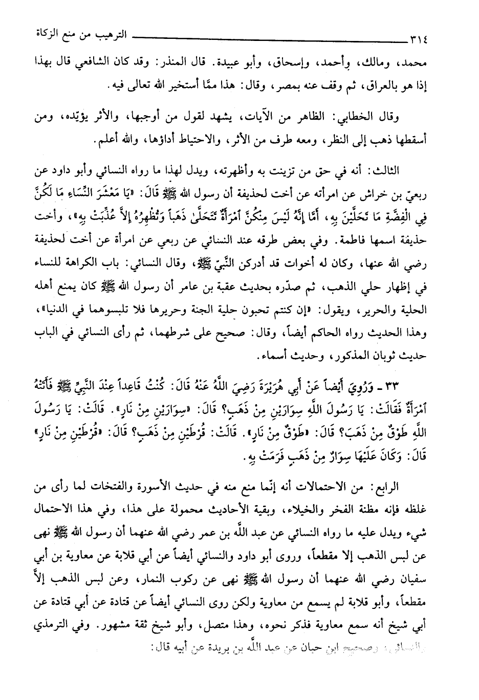 الثَّالِث أَنه فِي حق من تزينت بِهِ وأظهرته وَيدل لهَذَا مَا رَوَاهُ النَّسَائِيّ وَأَبُو دَاوُد عَن ربعي بن خرَاش عَن امْرَأَته عَن أُخْت لِحُذَيْفَة أَن رَسُول الله صلى الله عَلَيْهِ وَسلم قَالَ يَا معشر النِّسَاء مَا لَكِن فِي الْفضة مَا تحلين بِهِ أما إِنَّه لَيْسَ مِنْكُن امْرَأَة تتحلى ذَهَبا وتظهره إِلَّا عذبت بِهِ وَأُخْت حُذَيْفَة اسْمهَا فَاطِمَة