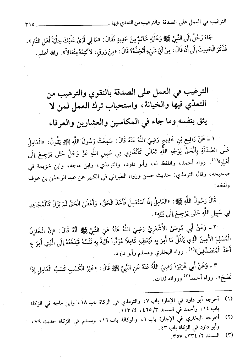 التَّرْغِيب فِي الْعَمَل على الصَّدَقَة بالتقوى والترهيب من التَّعَدِّي فِيهَا والخيانة واستحباب ترك الْعَمَل لمن لَا يَثِق بِنَفسِهِ وَمَا جَاءَ فِي المكاسين والعشارين والعرفاء