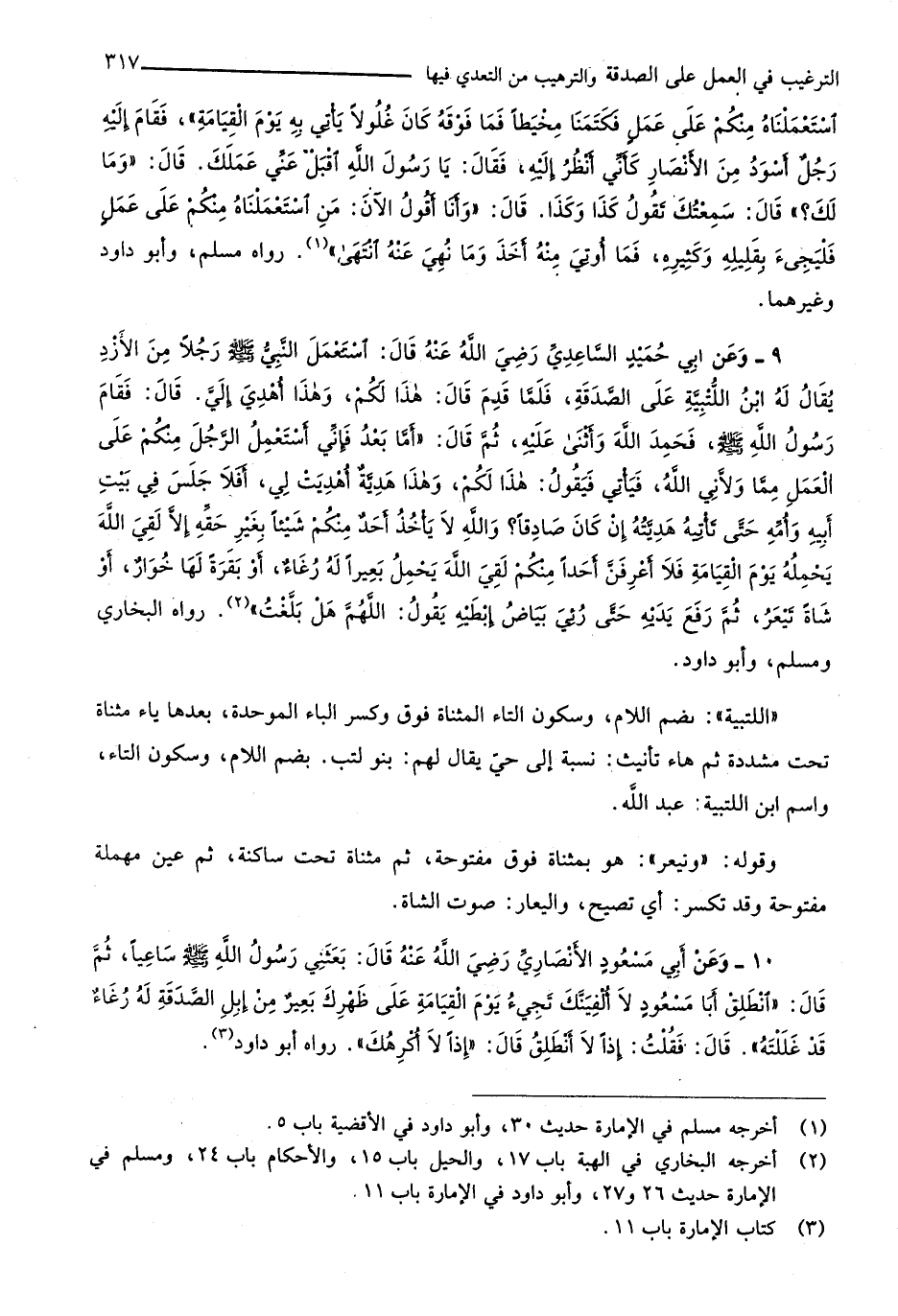 قَالَ فَقَامَ رَسُول الله صلى الله عَلَيْهِ وَسلم فَحَمدَ الله وَأثْنى عَلَيْهِ ثمَّ قَالَ أما بعد فَإِنِّي أسْتَعْمل الرجل مِنْكُم على الْعَمَل مِمَّا ولاني الله فَيَأْتِي فَيَقُول هَذَا لكم وَهَذَا هَدِيَّة أهديت لي أَفلا جلس فِي بَيت أَبِيه وَأمه حَتَّى تَأتيه هديته إِن كَانَ صَادِقا وَالله لَا يَأْخُذ أحد مِنْكُم شَيْئا بِغَيْر حَقه إِلَّا لَقِي الله يحملهُ يَوْم الْقِيَامَة فَلَا أَعرفن أحدا مِنْكُم لَقِي الله يحمل بَعِيرًا لَهُ رُغَاء أَو بقرة لَهَا خوار أَو شَاة تَيْعر ثمَّ رفع يَدَيْهِ حَتَّى رئي بَيَاض إبطَيْهِ يَقُول اللَّهُمَّ هَل بلغت