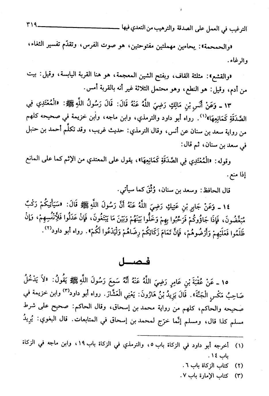 رَوَاهُ أَبُو دَاوُد وَالتِّرْمِذِيّ وَابْن مَاجَه وَابْن خُزَيْمَة فِي صَحِيحه كلهم من رِوَايَة سعد بن سِنَان عَن أنس وَقَالَ التِّرْمِذِيّ حَدِيث غَرِيب وَقد تكلم أَحْمد بن حَنْبَل فِي سعد بن سِنَان ثمَّ قَالَ وَقَوله المعتدي فِي الصَّدَقَة كمانعها يَقُول على المعتدي من الْإِثْم كَمَا على الْمَانِع إِذا منع