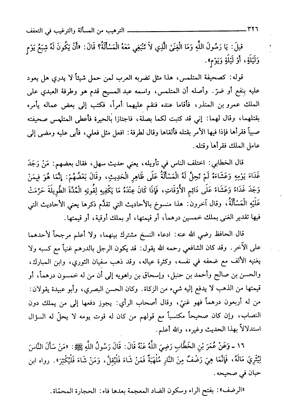 1200 - وَعَن عمر بن الْخطاب رَضِي الله عَنهُ قَالَ قَالَ رَسُول الله صلى الله عَلَيْهِ وَسلم من سَأَلَ النَّاس ليثري مَاله فَإِنَّمَا هِيَ رضف من النَّار ملهبة فَمن شَاءَ فَلْيقل وَمن شَاءَ فليكثر