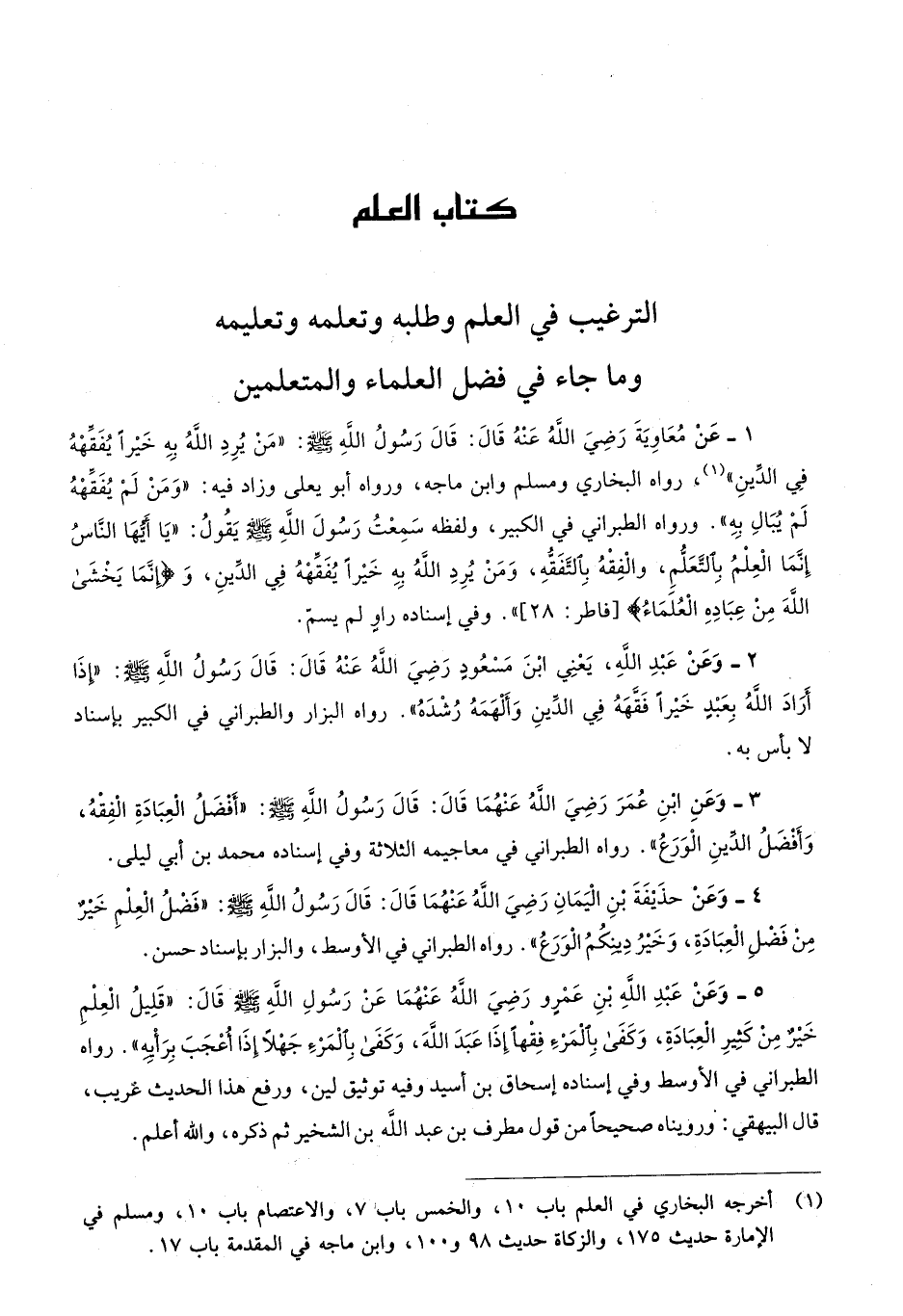 100 - عَن مُعَاوِيَة رَضِي الله عَنهُ قَالَ قَالَ رَسُول الله صلى الله عَلَيْهِ وَسلم من يرد الله بِهِ خيرا يفقهه فِي الدّين رَوَاهُ البُخَارِيّ وَمُسلم وَابْن مَاجَه وَرَوَاهُ أَبُو يعلى وَزَاد فِيهِ وَمن لم يفقهه لم يبال بِهِ