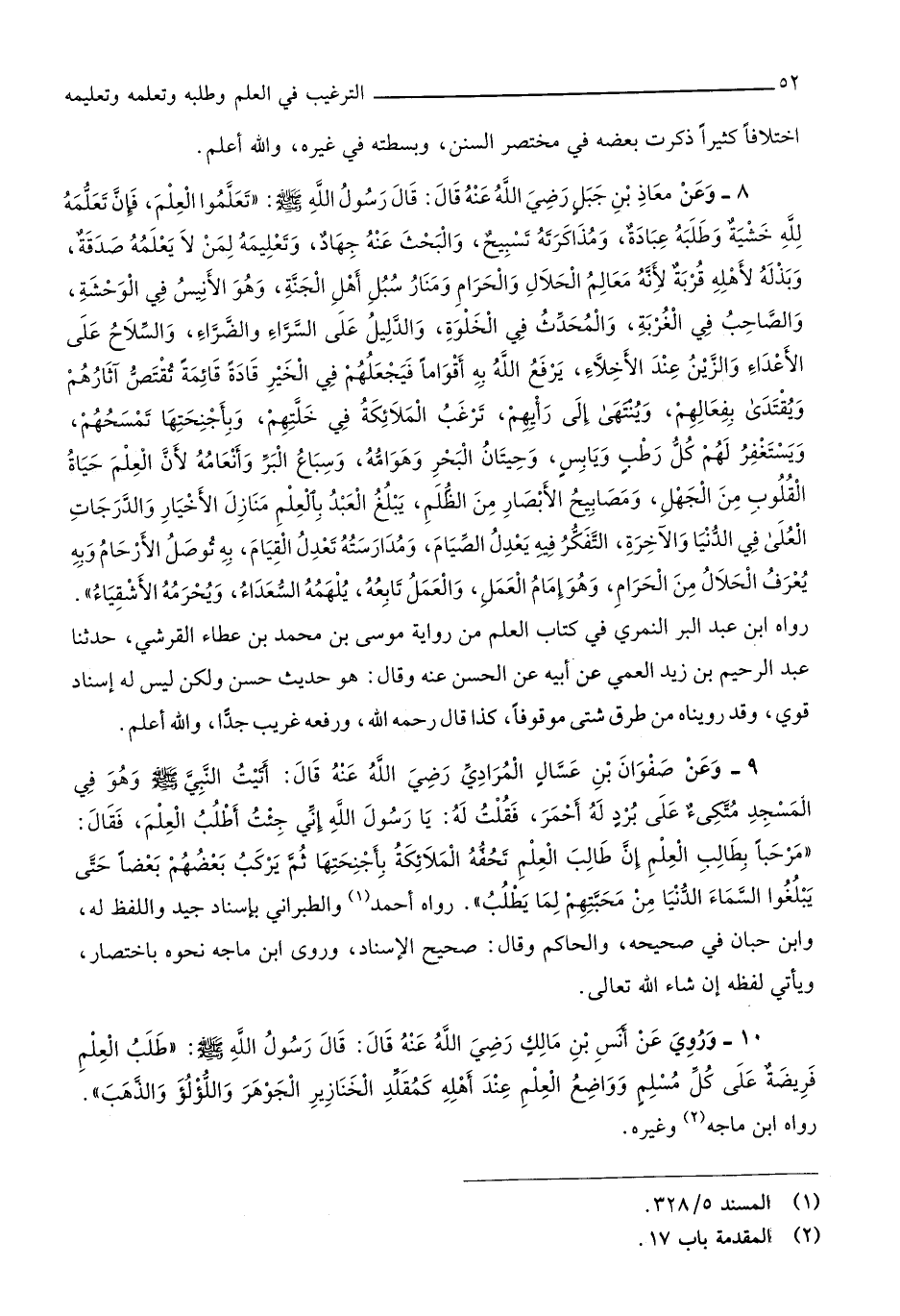 107 - وَعَن معَاذ بن جبل رَضِي الله عَنهُ قَالَ قَالَ رَسُول الله صلى الله عَلَيْهِ وَسلم تعلمُوا الْعلم فَإِن تعلمه لله خشيَة وَطَلَبه عبَادَة ومذاكرته تَسْبِيح والبحث عَنهُ جِهَاد وتعليمه لمن لَا يُعلمهُ صَدَقَة وبذله لأَهله قربَة لانه معالم الْحَلَال وَالْحرَام ومنار سبل أهل الْجنَّة وَهُوَ الأنيس فِي الوحشة والصاحب فِي الغربة والمحدث فِي الْخلْوَة وَالدَّلِيل على السَّرَّاء وَالضَّرَّاء وَالسِّلَاح على الْأَعْدَاء والزين عِنْد الأخلاء يرفع الله بِهِ أَقْوَامًا فيجعلهم فِي الْخَيْر قادة قَائِمَة تقتص آثَارهم ويقتدى بفعالهم وينتهى إِلَى رَأْيهمْ ترغب الْمَلَائِكَة فِي خلتهم وبأجنحتها تمسحهم ويستغفر لَهُم كل رطب ويابس وحيتان الْبَحْر وهوامه وسباع الْبر وأنعامه لِأَن الْعلم حَيَاة الْقُلُوب من الْجَهْل ومصابيح الْأَبْصَار من الظُّلم يبلغ العَبْد بِالْعلمِ منَازِل الأخيار والدرجات العلى فِي الدُّنْيَا وَالْآخِرَة التفكر فِيهِ يعدل الصّيام ومدارسته تعدل الْقيام بِهِ توصل الْأَرْحَام وَبِه يعرف الْحَلَال من الْحَرَام وَهُوَ إِمَام الْعَمَل وَالْعَمَل تَابعه يلهمه السُّعَدَاء ويحرمه الأشقياء