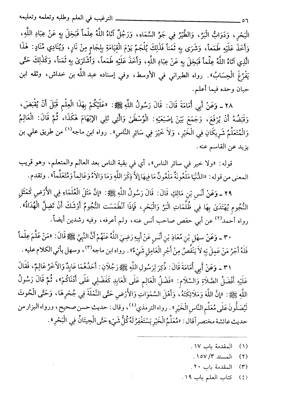 130 - وَعَن أبي أُمَامَة قَالَ ذكر لرَسُول الله صلى الله عَلَيْهِ وَسلم رجلَانِ أَحدهمَا عَابِد وَالْآخر عَالم فَقَالَ عَلَيْهِ أفضل الصَّلَاة وَالسَّلَام فضل الْعَالم على العابد كفضلي على أدناكم ثمَّ قَالَ رَسُول الله صلى الله عَلَيْهِ وَسلم إِن الله وَمَلَائِكَته وَأهل السَّمَوَات وَالْأَرْض حَتَّى النملة فِي جحرها وَحَتَّى الْحُوت ليصلون على معلم النَّاس الْخَيْر
