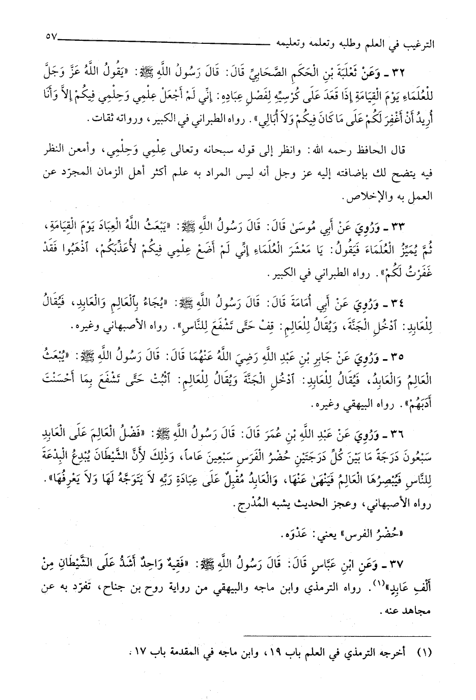 135 - وَرُوِيَ عَن عبد الله بن عمر قَالَ قَالَ رَسُول الله صلى الله عَلَيْهِ وَسلم فضل الْعَالم على العابد سَبْعُونَ دَرَجَة مَا بَين كل دَرَجَتَيْنِ حضر الْفرس سبعين عَاما وَذَلِكَ لَان الشَّيْطَان يبدع الْبِدْعَة للنَّاس فيبصرها الْعَالم فينهى عَنْهَا وَالْعَابِد مقبل على عبَادَة ربه لَا يتَوَجَّه لَهَا وَلَا يعرفهَا