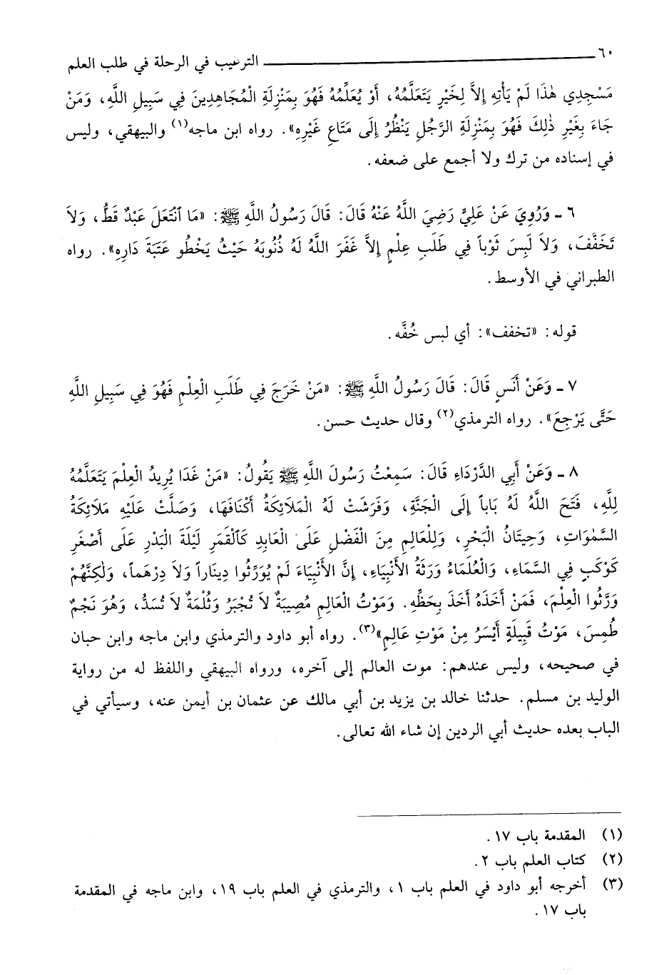 147 - وَرُوِيَ عَن عَليّ رَضِي الله عَنهُ قَالَ قَالَ رَسُول الله صلى الله عَلَيْهِ وَسلم مَا انتعل عبد قطّ وَلَا تخفف وَلَا لبس ثوبا فِي طلب علم إِلَّا غفر الله لَهُ ذنُوبه حَيْثُ يخطو عتبَة دَاره