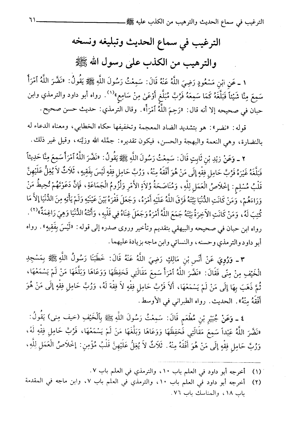 التَّرْغِيب فِي سَماع الحَدِيث وتبليغه ونسخه والترهيب من الْكَذِب على رَسُول الله صلى الله عَلَيْهِ وَسلم