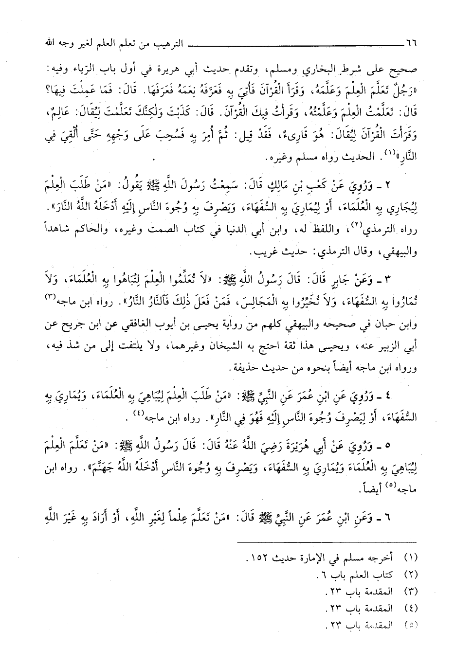 178 - وَرُوِيَ عَن كَعْب بن مَالك قَالَ سَمِعت رَسُول الله صلى الله عَلَيْهِ وَسلم يَقُول من طلب الْعلم ليجاري بِهِ الْعلمَاء أَو ليماري بِهِ السُّفَهَاء وَيصرف بِهِ وُجُوه النَّاس إِلَيْهِ أدخلهُ الله النَّار