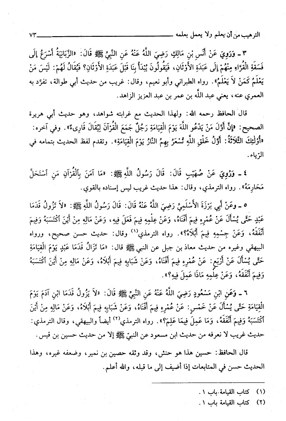 قَالَ الْحَافِظ رَحمَه الله وَلِهَذَا الحَدِيث مَعَ غرابته شَوَاهِد وَهُوَ حَدِيث أبي هُرَيْرَة الصَّحِيح إِن أول من يَدْعُو الله يَوْم الْقِيَامَة رجل جمع الْقُرْآن ليقال قارىء