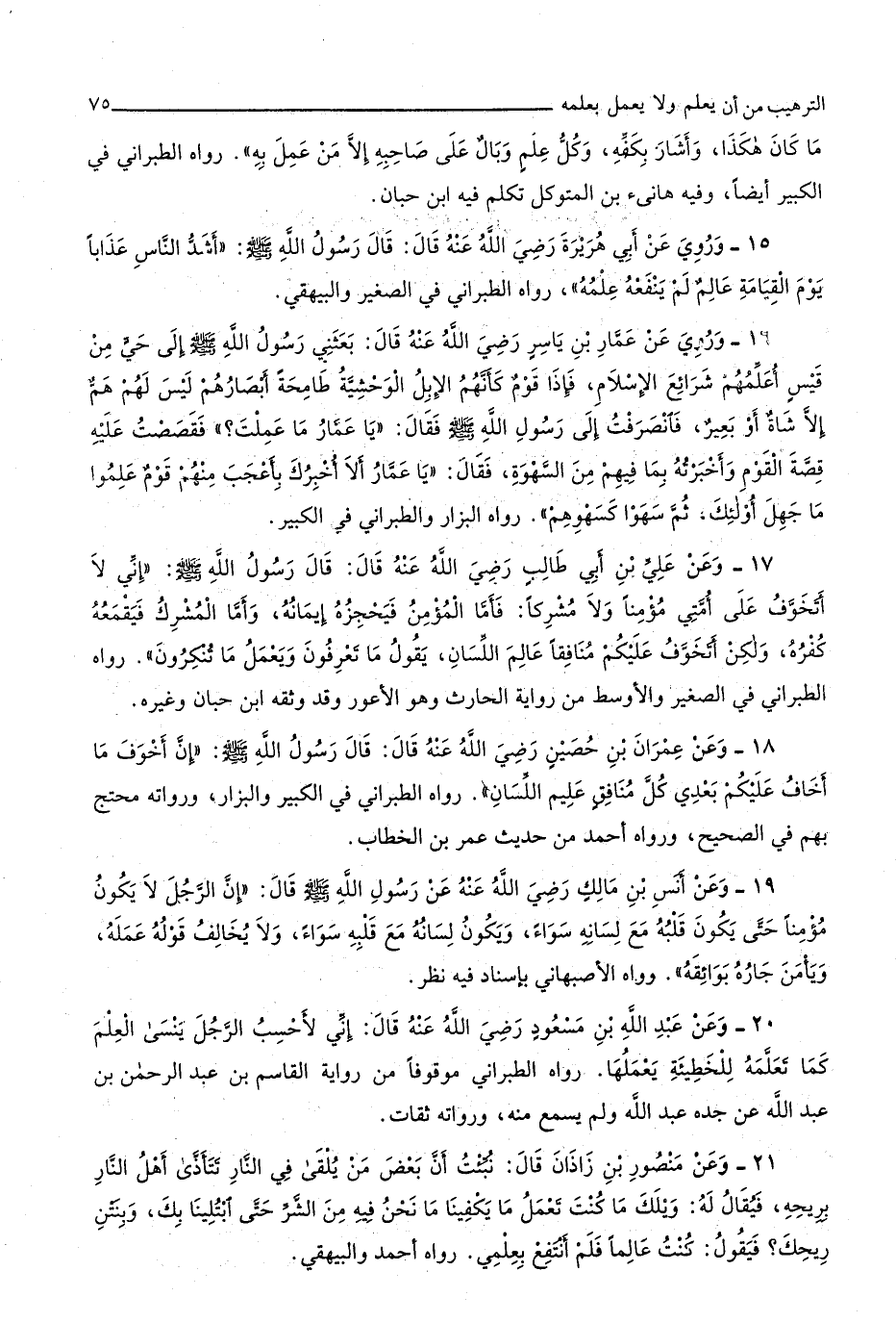 219 - وَرُوِيَ عَن أبي هُرَيْرَة رَضِي الله عَنهُ قَالَ قَالَ رَسُول الله صلى الله عَلَيْهِ وَسلم أَشد النَّاس عذَابا يَوْم الْقِيَامَة عَالم لم يَنْفَعهُ علمه رَوَاهُ الطَّبَرَانِيّ فِي الصَّغِير وَالْبَيْهَقِيّ