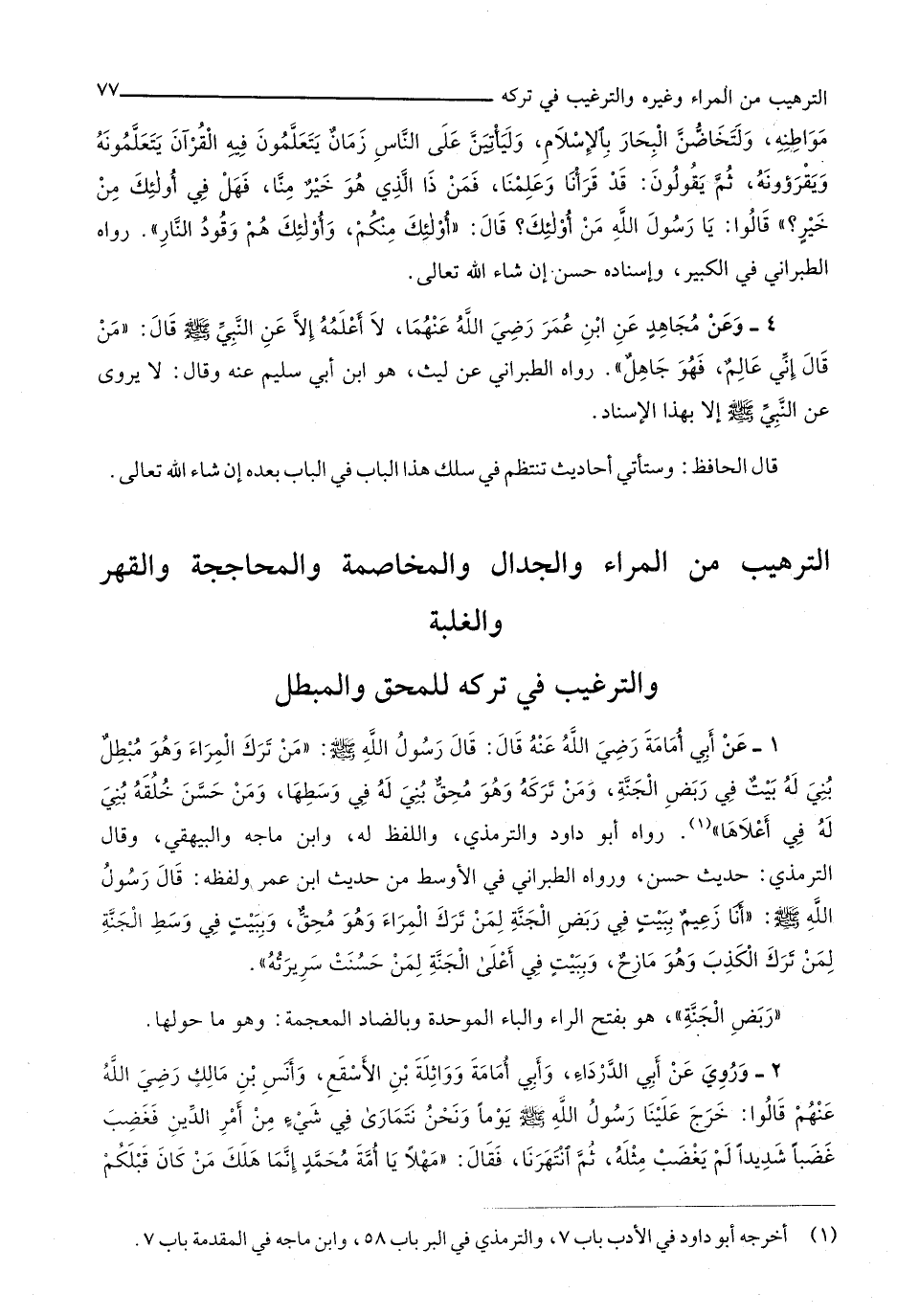 230 - عَن أبي أُمَامَة رَضِي الله عَنهُ قَالَ قَالَ رَسُول الله صلى الله عَلَيْهِ وَسلم من ترك المراء وَهُوَ مُبْطل بني لَهُ بَيت فِي ربض الْجنَّة وَمن تَركه وَهُوَ محق بني لَهُ فِي وَسطهَا وَمن حسن خلقه بني لَهُ فِي أَعْلَاهَا