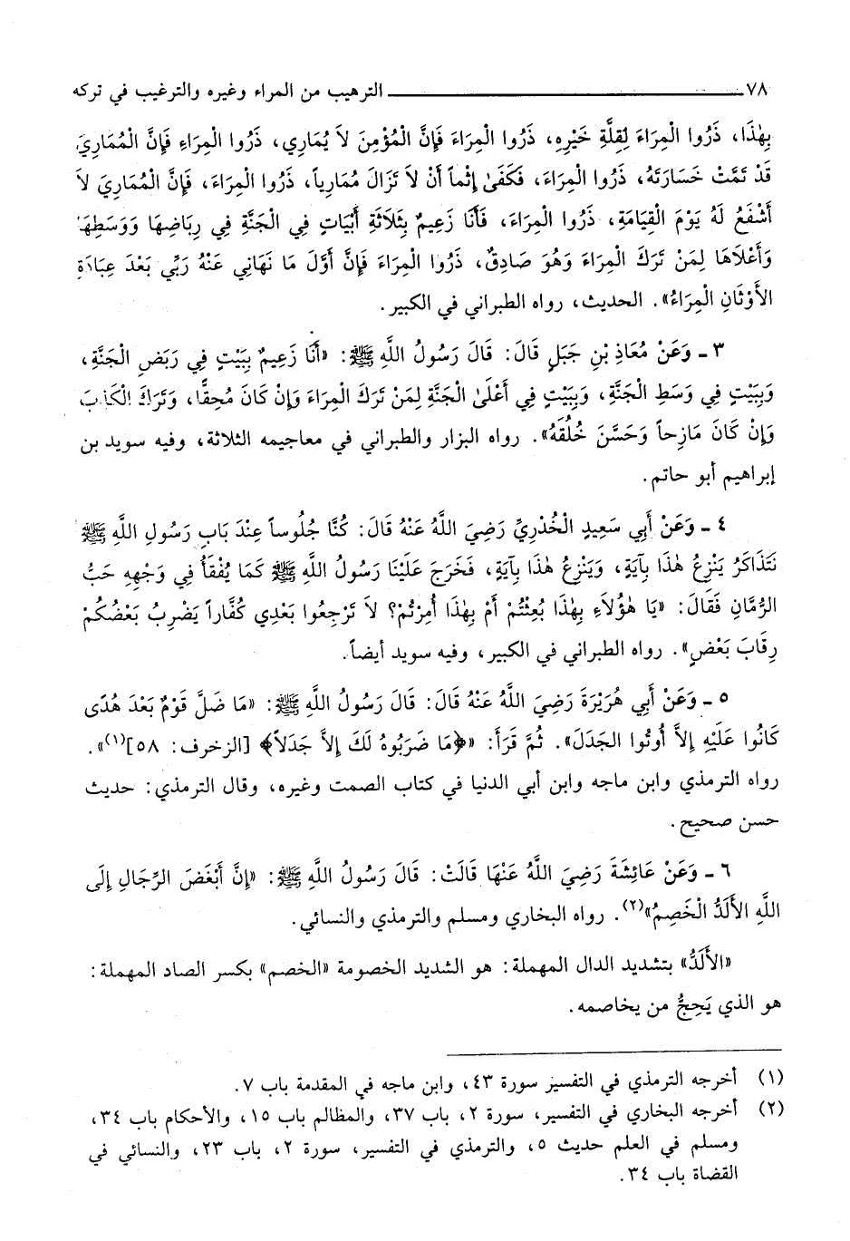 بِهَذَا ذَروا المراء لقلَّة خَيره ذَروا المراء فَإِن الْمُؤمن لَا يُمَارِي ذَروا المراء فَإِن المماري قد تمت خسارته ذَروا المراء فَكفى إِثْمًا أَن لَا تزَال مماريا ذَروا المراء فَإِن المماري لَا أشفع لَهُ يَوْم الْقِيَامَة ذَروا المراء فَأَنا زعيم بِثَلَاثَة أَبْيَات فِي الْجنَّة فِي رباضها ووسطها وأعلاها لمن ترك المراء وَهُوَ صَادِق ذَروا المراء فَإِن أول مَا نهاني عَنهُ رَبِّي بعد عبَادَة الْأَوْثَان المراء