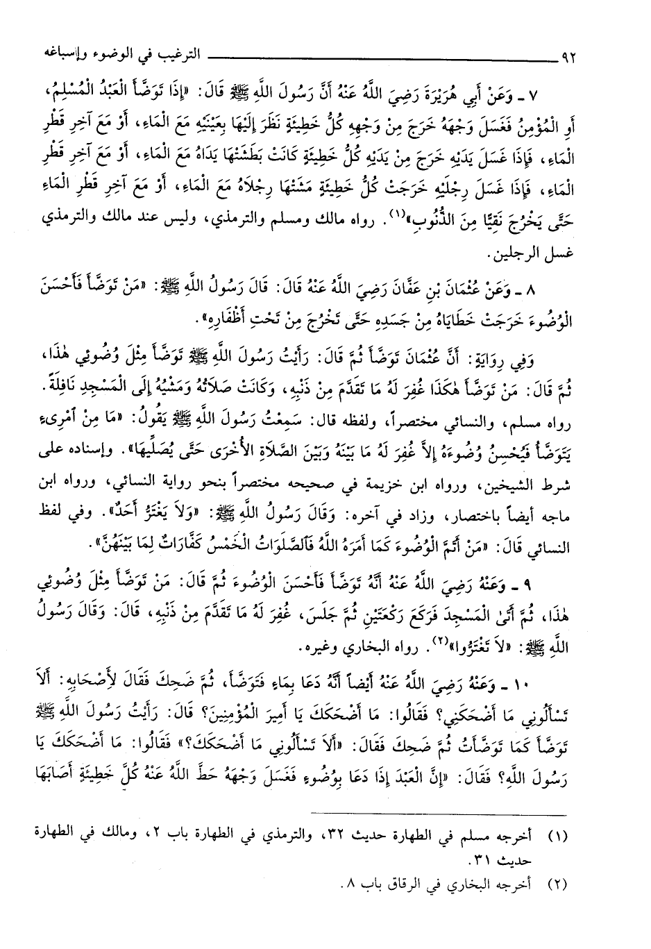 رَوَاهُ مَالك وَمُسلم وَالتِّرْمِذِيّ وَلَيْسَ عِنْد مَالك وَالتِّرْمِذِيّ غسل الرجلَيْن