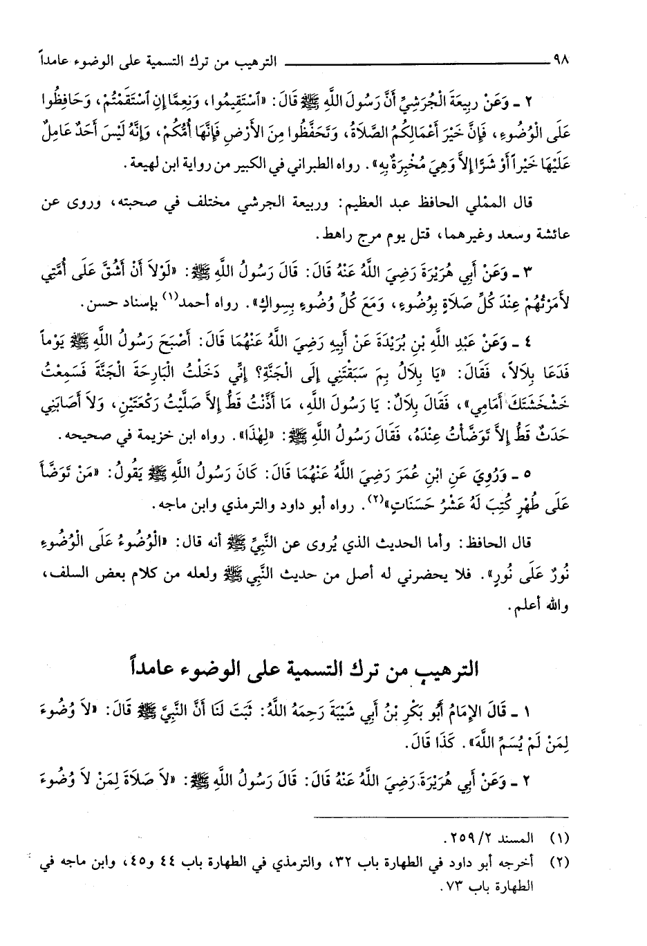 9 - التَّرْهِيب من ترك التَّسْمِيَة على الْوضُوء عَامِدًا