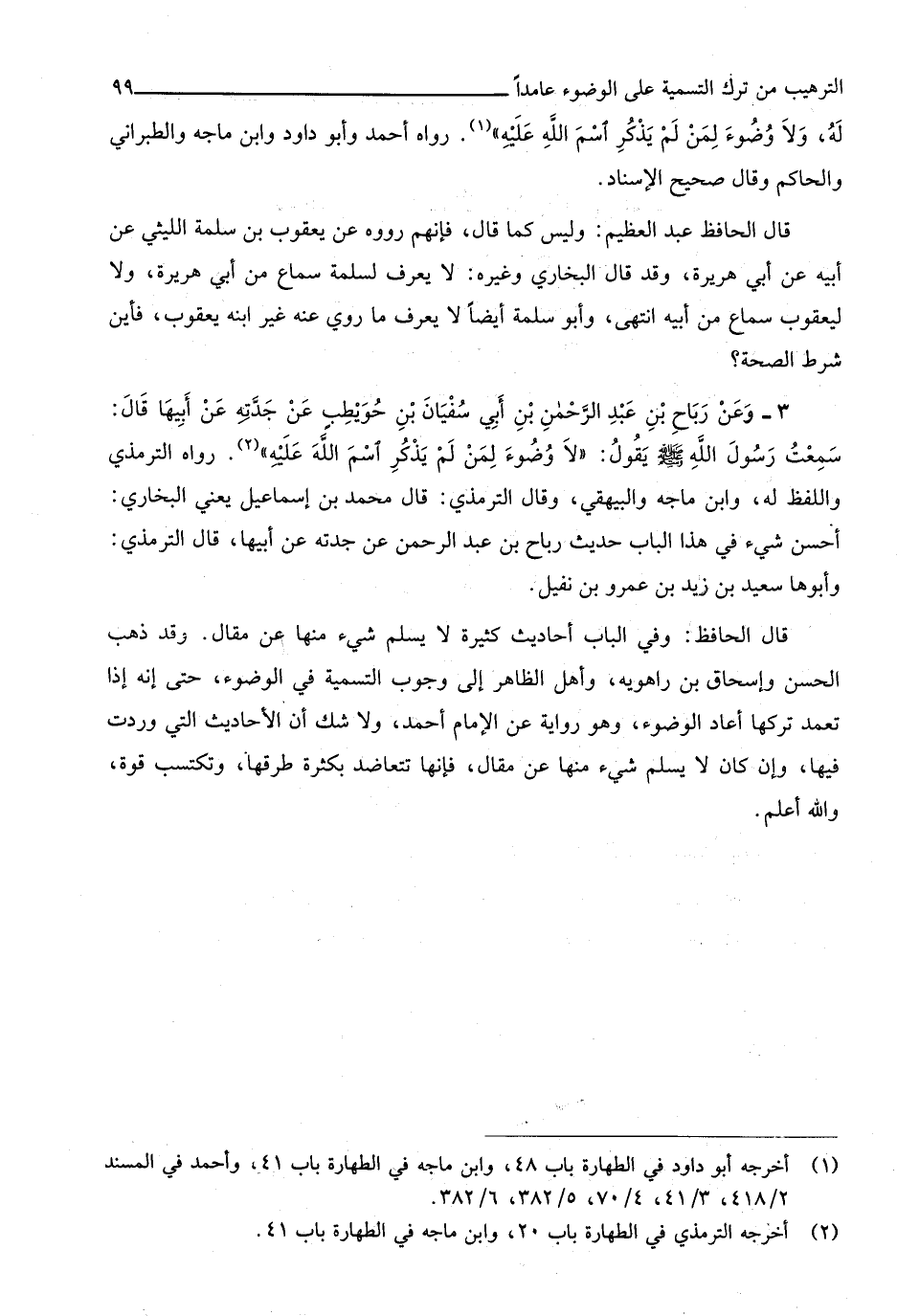 318 - وَعَن رَبَاح بن عبد الرَّحْمَن بن أبي سُفْيَان بن حويطب عَن جدته عَن أَبِيهَا قَالَ سَمِعت رَسُول الله صلى الله عَلَيْهِ وَسلم يَقُول لَا وضوء لمن لم يذكر اسْم الله عَلَيْهِ