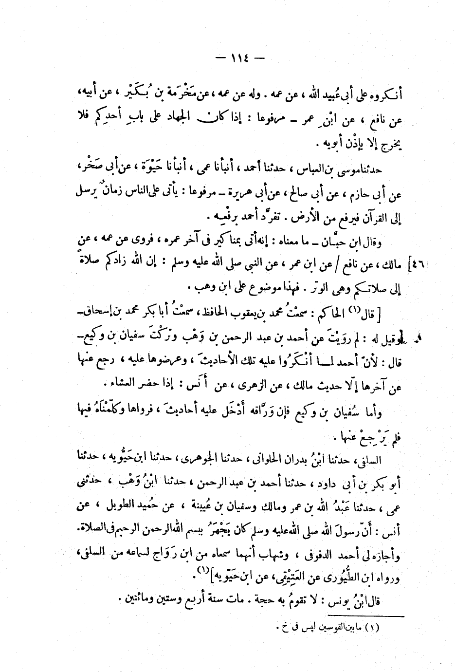 [قال (1) الحاكم: سمعت محمد بن يعقوب الحافظ، سمعت أبا بكر محمد بن إسحاق - وقيل له: لم رويت عن أحمد بن عبد الرحمن بن وهب وتركت سفيان بن وكيع - قال: لان أحمد لما أنكروا عليه تلك الأحاديث، وعرضوها عليه، رجع عنها عن آخرها إلا حديث مالك، عن الزهري، عن أنس: إذا حضر العشاء.