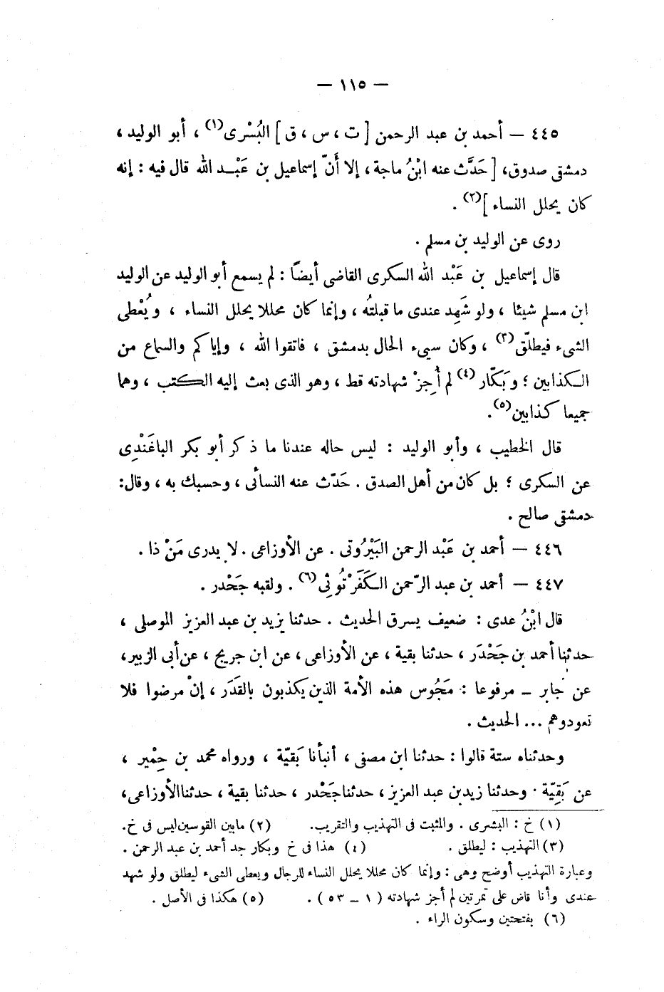 445 - أحمد بن عبد الرحمن [ت، س، ق] البسري (1) ، أبو الوليد، دمشقي صدوق، [حدث عنه ابن ماجة، إلا أن إسماعيل بن عبد الله قال فيه: إنه كان يحلل النساء] (2) .