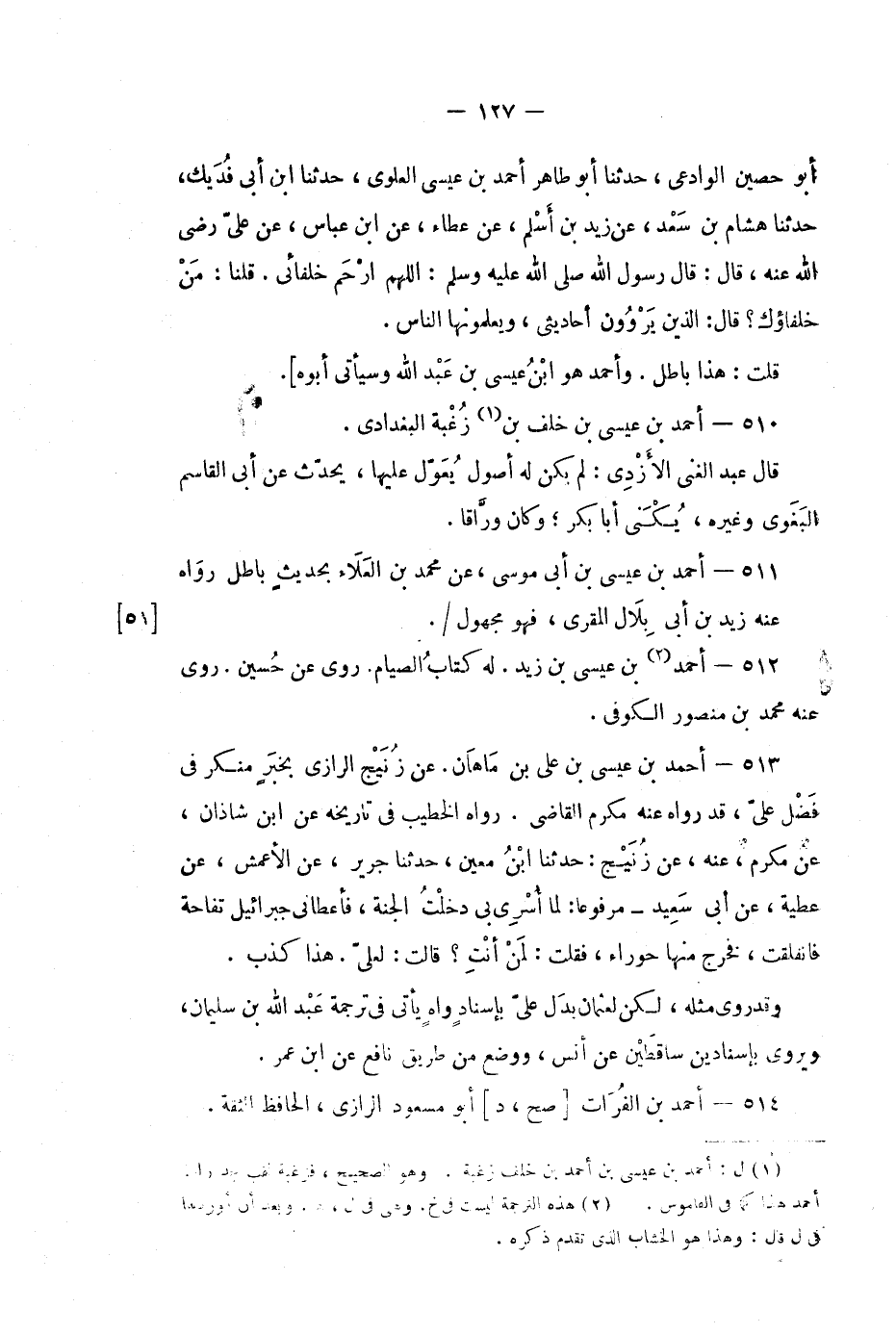 511 - أحمد بن عيسى بن أبي موسى، عن محمد بن العلاء بحديث باطل رواه عنه زيد بن أبي بلال المقري، فهو مجهول /.