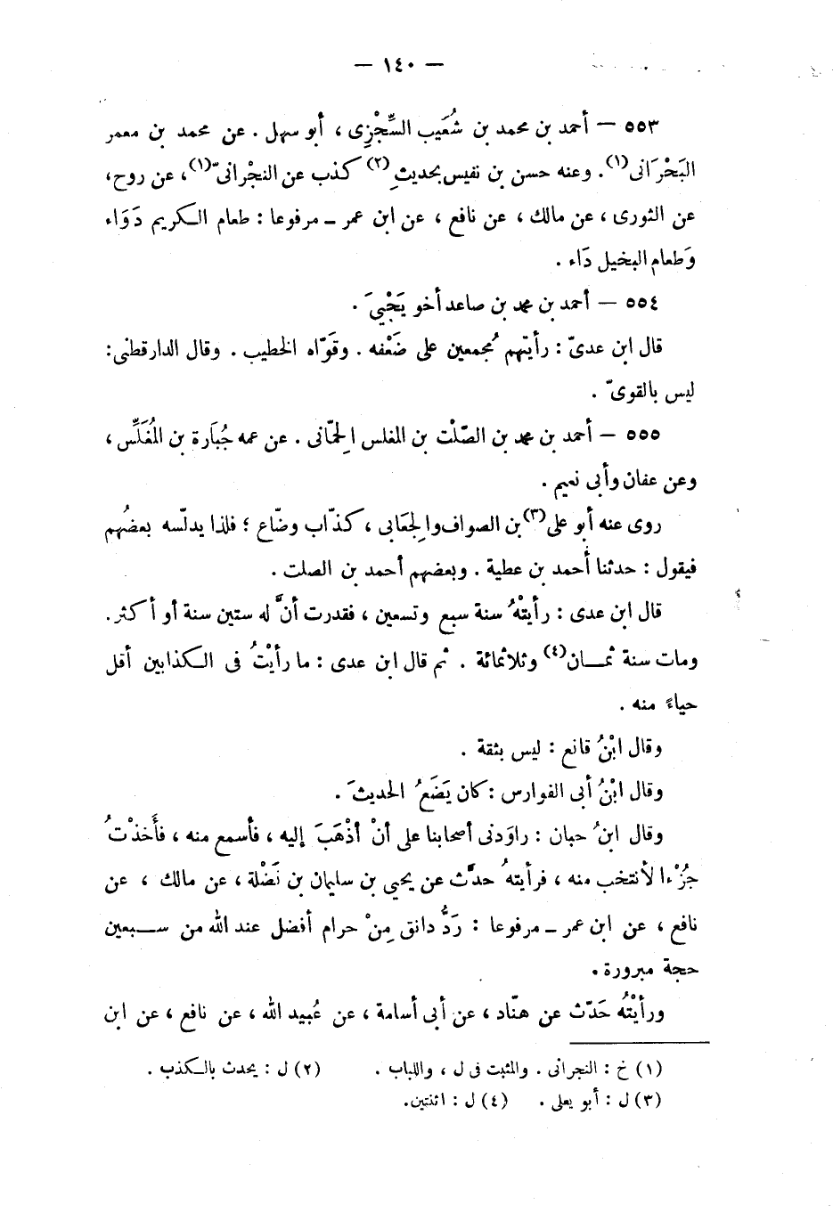 وقال ابن حبان: راودني أصحابنا على أن أذهب إليه، فأسمع منه، فأخذت جزء الانتخب منه، فرأيته حدث عن يحيى بن سليمان بن نضلة، عن مالك، عن نافع، عن ابن عمر - مرفوعاً: رد دانق من حرام أفضل عند الله من سبعين حجة مبرورة.