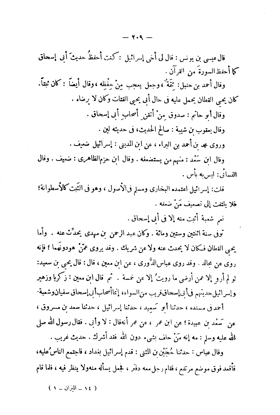 قلت: إسرائيل اعتمده البخاري ومسلم في الأصول، وهو في الثبت كالاسطوانة، فلا يلتفت إلى تصعيف من ضعفه.