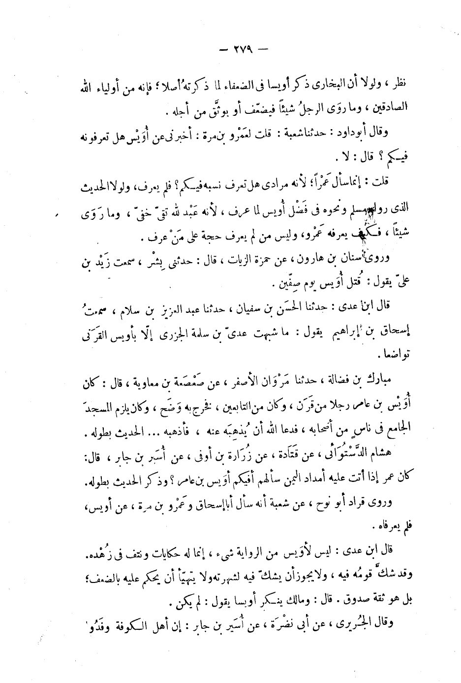 نظر، ولولا أن البخاري ذكر أويساً في الضعفاء لما ذكرته أصلا، فإنه من أولياء الله الصادقين، وما روى الرجل شيئا فيضعف أو يوثق من أجله.