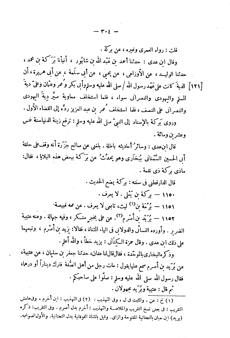 وقال ابن عدي: حدثنا أحمد بن عبد الله بن شابور، أنبأنا بركة بن محمد، حدثنا الوليد، عن الأوزاعي، عن يحيى، عن أبي سلمة، عن أبي هريرة، أن الدية كانت على عهد رسول الله / صلى الله عليه وسلم وأبي بكر وعمر وعثمان وعلى دية المسلم واليهودى والنصراني سواء، فلما استخلف معاوية صير دية اليهودي والنصراني على النصف، فلما استخلف عمر بن عبد العزيز رده إلى القضاء الاول.