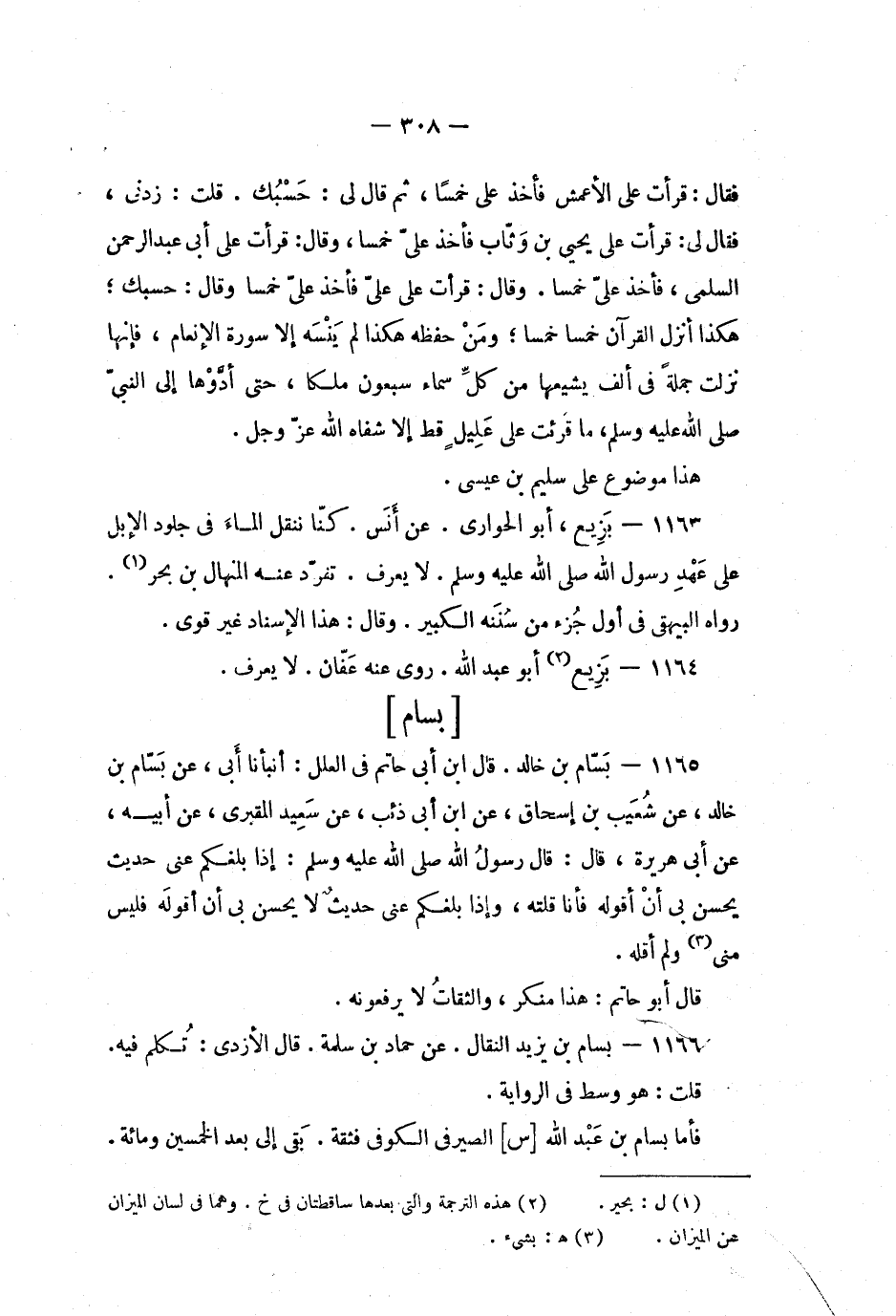 قال ابن أبي حاتم في العلل: أنبأنا أبي، عن بسام بن خالد، عن شعيب بن إسحاق، عن ابن أبي ذئب، عن سعيد المقبري، عن أبيه، عن أبي هريرة، قال: قال رسول الله صلى الله عليه وسلم: إذا بلغكم عنى حديث يحسن بن أن أقوله فأنا قلته، وإذا بلغكم عنى حديث لا يحسن بي أن أقوله فليس مني (3) ولم أقله.