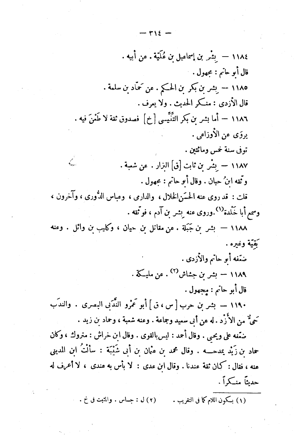 1186 - أما بشر بن بكر التنيسى [خ] فصدوق ثقة لا طعن فيه.