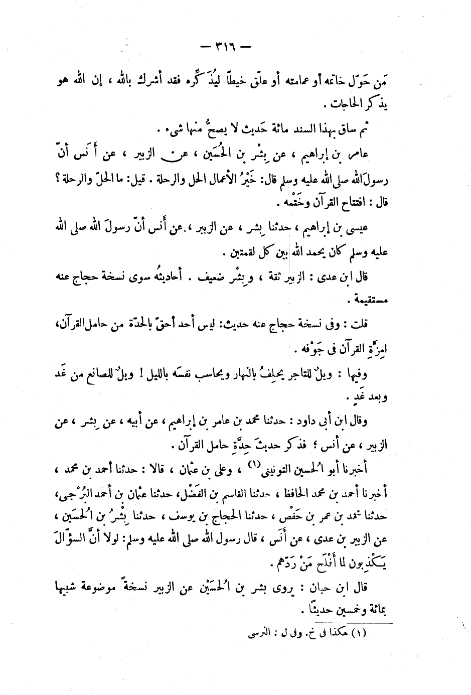 عامر بن إبراهيم، عن بشر بن الحسين، عن الزبير، عن أنس أن رسول الله صلى الله عليه وسلم قال: خير الاعمال الحل والرحلة.