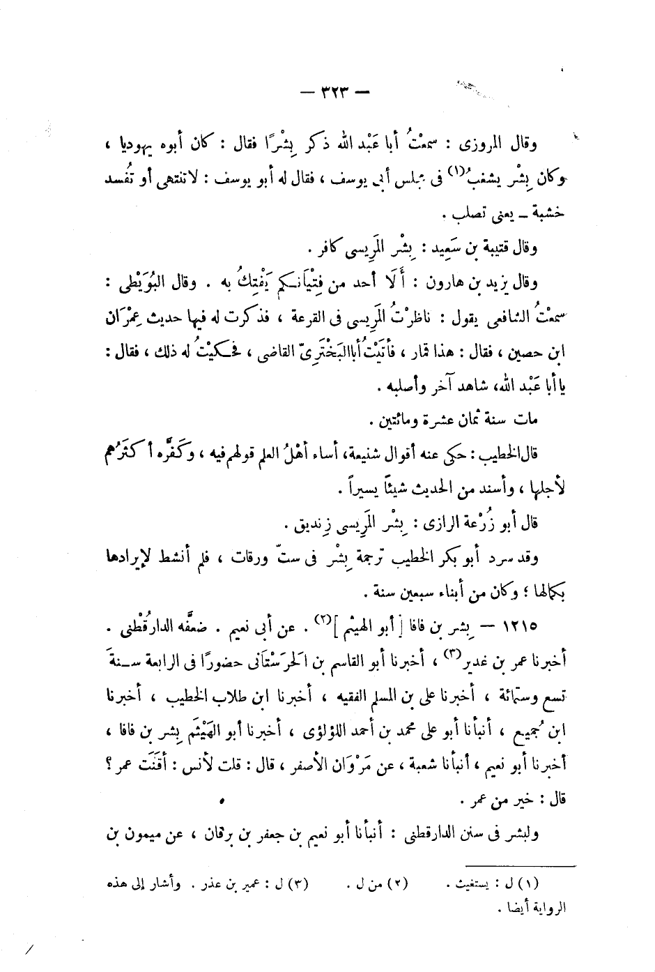 وقد سرد أبو بكر الخطيب ترجمة بشر في ست ورقات، فلم أنشط لايرادها بكمالها، وكان من أبناء سبعين سنة.
