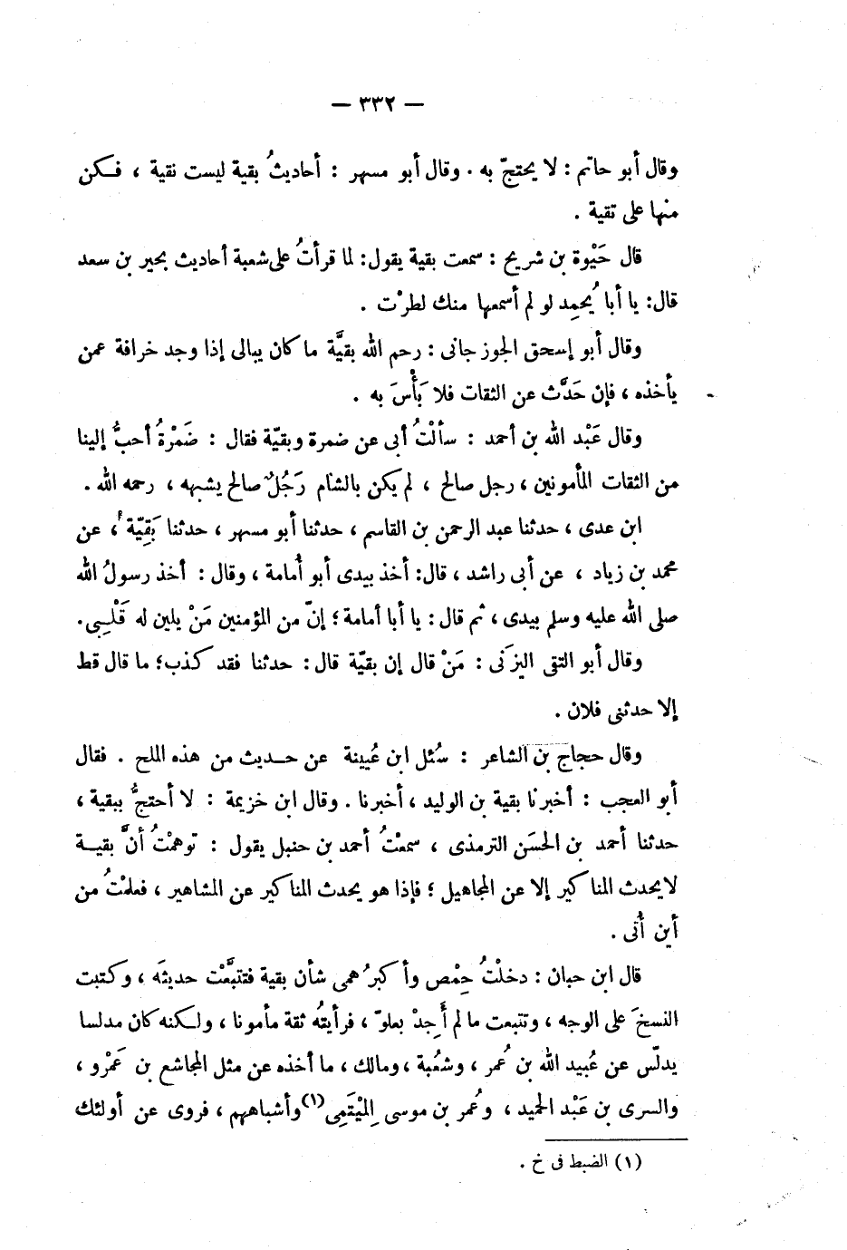 قال ابن حبان: دخلت حمص وأكبر همى شأن بقية فتتبعت حديثه، وكتبت النسخ على الوجه، وتتبعت ما لم أجد بعلو، فرأيته ثقة مأمونا، ولكنه كان مدلسا يدلس عن عبيد الله بن عمر، وشعبة، ومالك، ما أخذه عن مثل المجاشع بن عمرو، والسري بن عبد الحميد، وعمر بن موسى الميتمى (1) وأشباههم، فروى عن أولئك