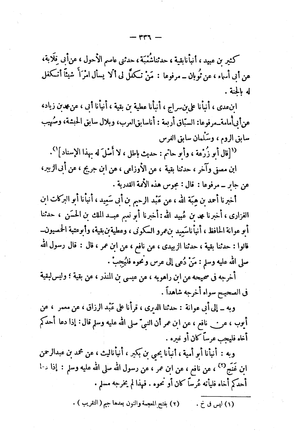 أخبرنا أحمد بن هبة الله، عن عبد الرحيم بن أبي سعيد، أنبأنا أبو البركات ابن الفزاري، أخبرنا محمد بن عبيد الله: أخبرنا أبو نعيم عبد الملك بن الحسن، حدثنا أبو عوانة الحافظ، أنبأنا سعيد بن عمرو السكوني، وعطية بن بقية، وأبو عتبة الحمصيون - قالوا: حدثنا بقية، حدثنا الزبيدي، عن نافع، عن ابن عمر، قال: قال رسول الله صلى الله عليه وسلم: من دعى إلى عرس ونحوه فليجب.