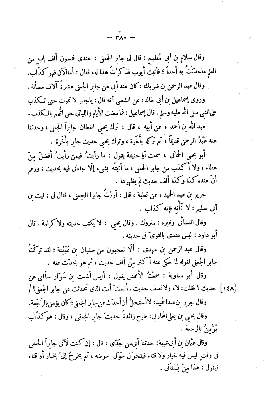 ألست أنت الذي تحدثت عن جابر الجعفي؟ / وقال جرير بن عبد الحميد: لا أستحل أن أحدث عن جابر الجعفي، كان يؤمن بالرجعة.