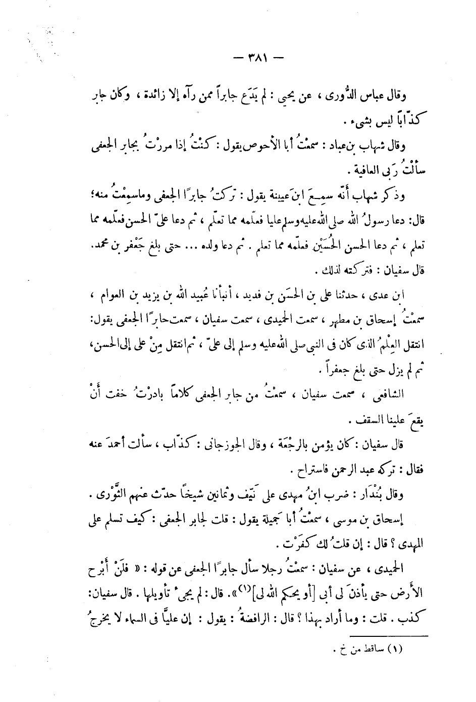 الشافعي، سمعت سفيان، سمعت من جابر الجعفي كلاما بادرت خفت أن يقع علينا السقف.