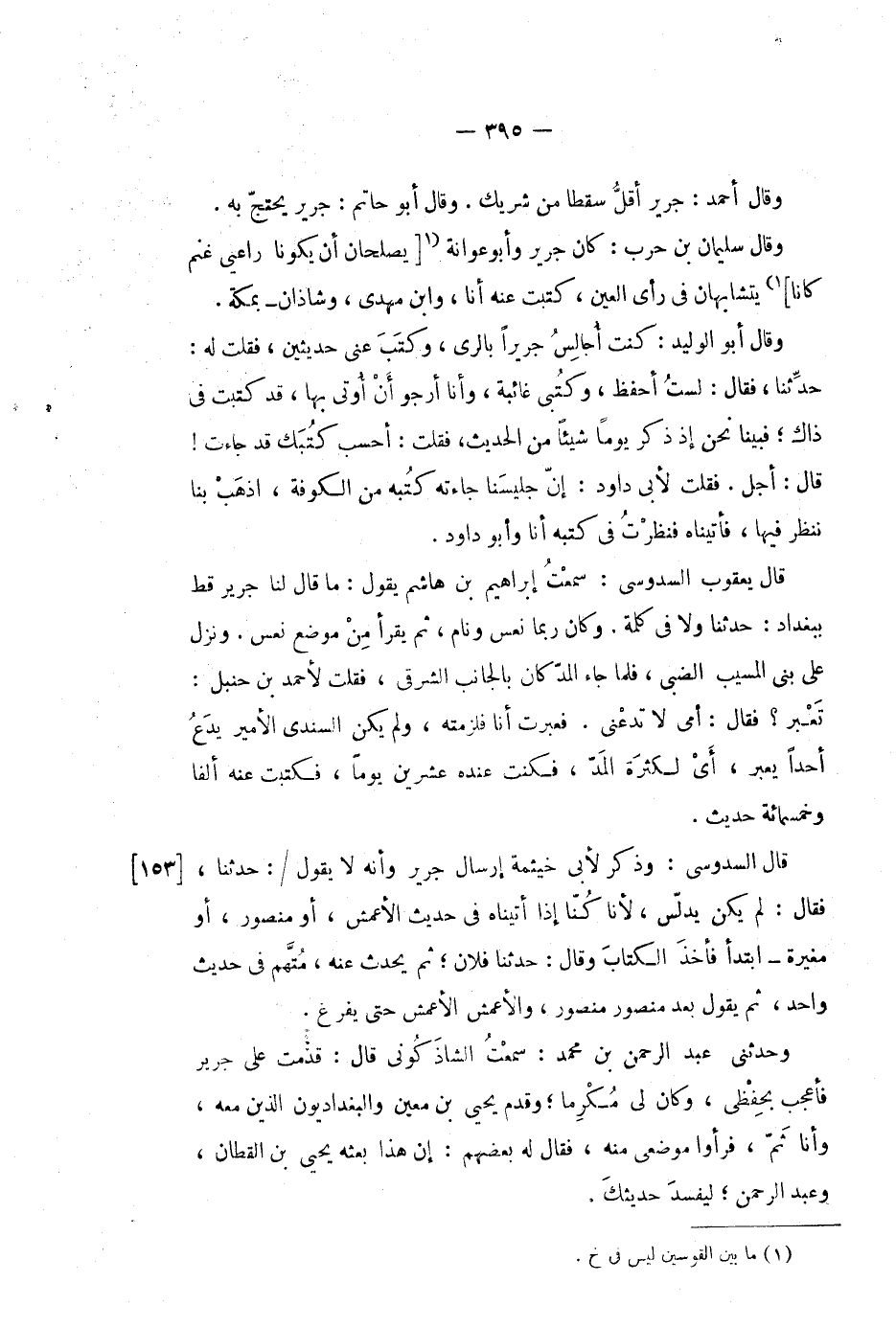 قال السدوسي: وذكر لأبي خيثمة إرسال جرير وأنه لا يقول /: حدثنا، فقال: لم يكن يدلس، لانا كنا إذا أتيناه في حديث الأعمش، أو منصور، أو مغيرة - ابتدأ فأخذ الكتاب وقال: حدثنا فلان، ثم يحدث عنه، متهم في حديث واحد، ثم يقول بعد منصور منصور، والأعمش الأعمش حتى يفرغ.