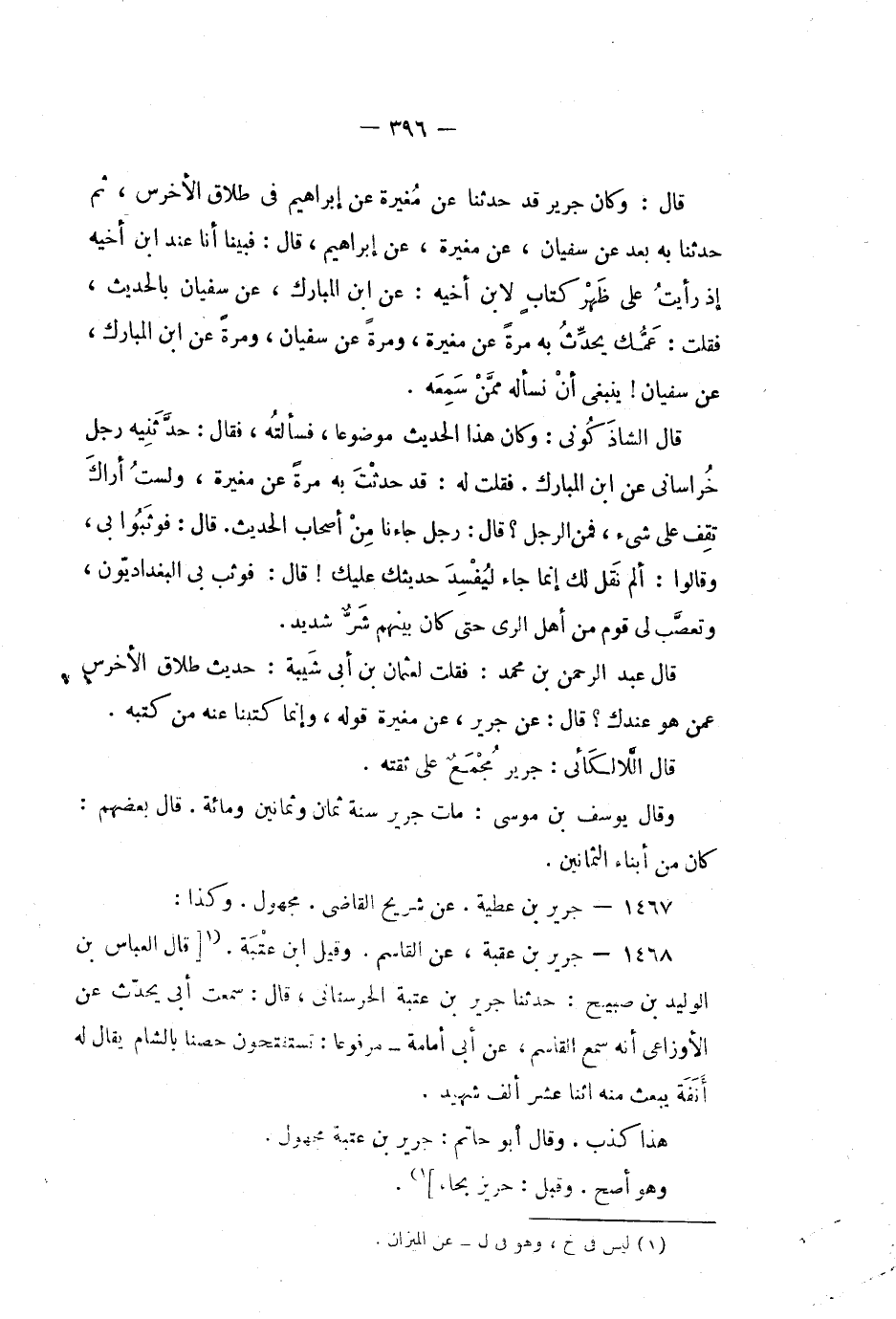 قال: وكان جرير قد حدثنا عن مغيرة عن إبراهيم في طلاق الاخرس، ثم حدثنا به بعد عن سفيان، عن مغيرة، عن إبراهيم، قال: فبينا أنا عند ابن أخيه إذ رأيت على ظهر كتاب لابن أخيه: عن ابن المبارك، عن سفيان بالحديث، فقلت: عمك يحدث به مرة عن مغيرة، ومرة عن سفيان، ومرة عن ابن المبارك، عن سفيان! ينبغي أن نسأله ممن سمعه.