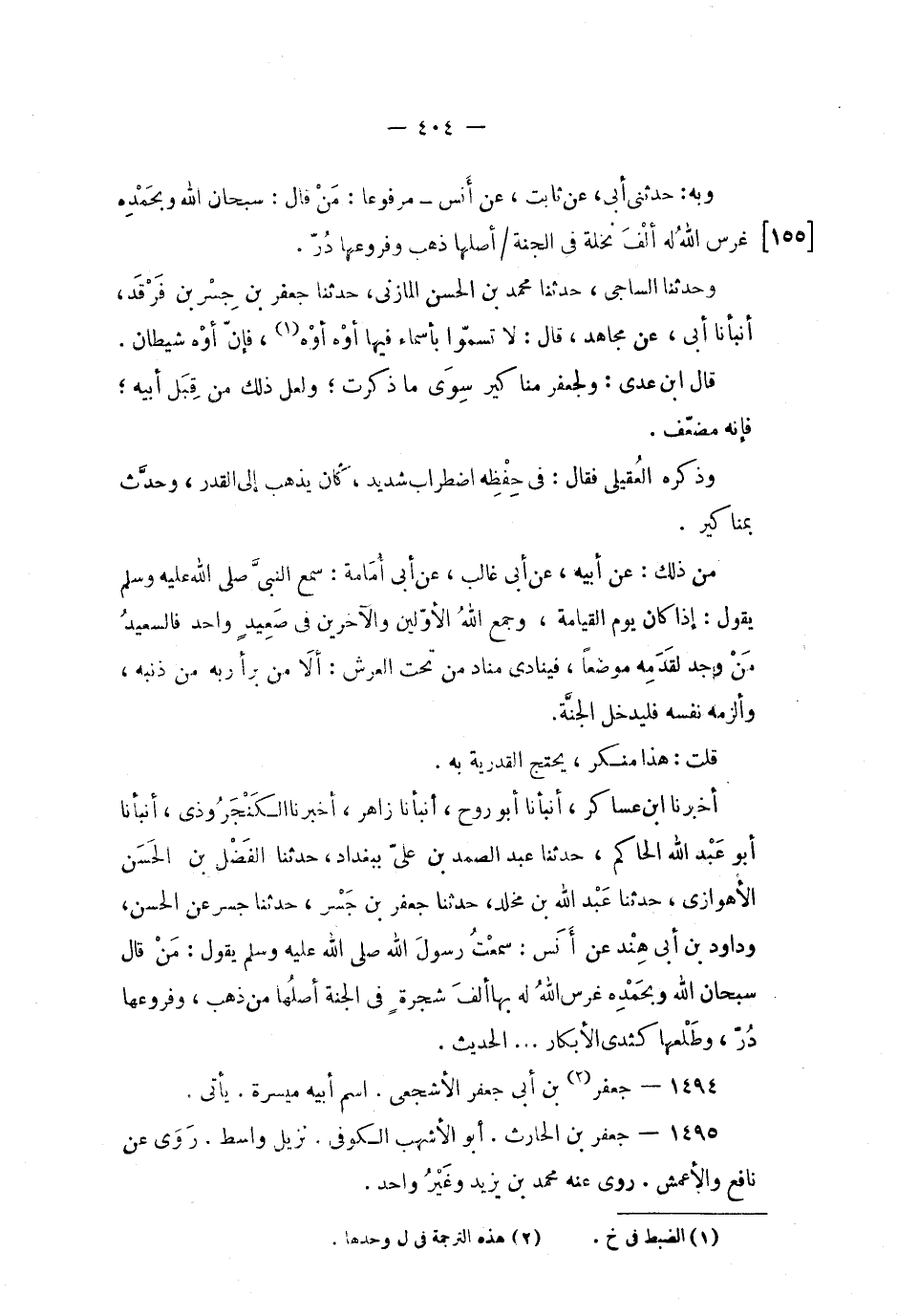 أخبرنا ابن عساكر، أنبأنا أبو روح، أنبأنا زاهر، أخبرنا الكنجروذى، أنبأنا أبو عبد الله الحاكم، حدثنا عبد الصمد بن علي ببغداد، حدثنا الفضل بن الحسن الأهوازي، حدثنا عبد الله بن مخلد، حدثنا جعفر بن جسر، حدثنا جسر عن الحسن، وداود بن أبي هند عن أنس: سمعت رسول الله صلى الله عليه وسلم يقول: من قال سبحان الله وبحمده غرس الله له بها ألف شجرة في الجنة أصلها من ذهب، وفروعها در، وطلعها كثدي الابكار..الحديث.