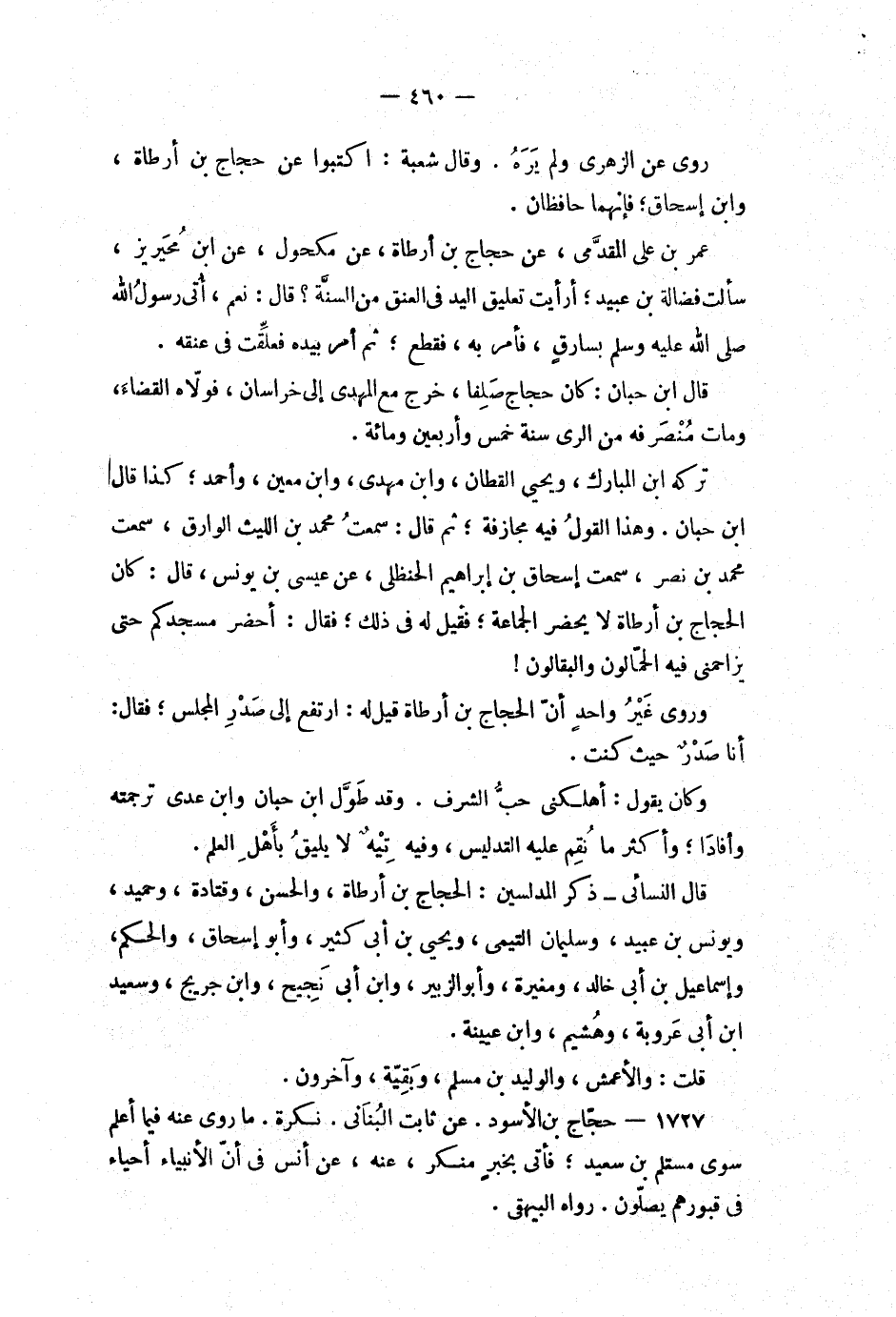 وهذا القول فيه مجازفة، ثم قال: سمعت محمد بن الليث الوارق، سمعت محمد بن نصر، سمعت إسحاق بن إبراهيم الحنظلي، عن عيسى بن يونس، قال: كان الحجاج بن أرطاة لا يحضر الجماعة، فقيل له في ذلك، فقال: أحضر مسجدكم حتى يزاحمنى فيه الحمالون والبقالون! وروى غير واحد أن الحجاج بن أرطاة قيل له: ارتفع إلى صدر المجلس، فقال: أنا صدر حيث كنت.