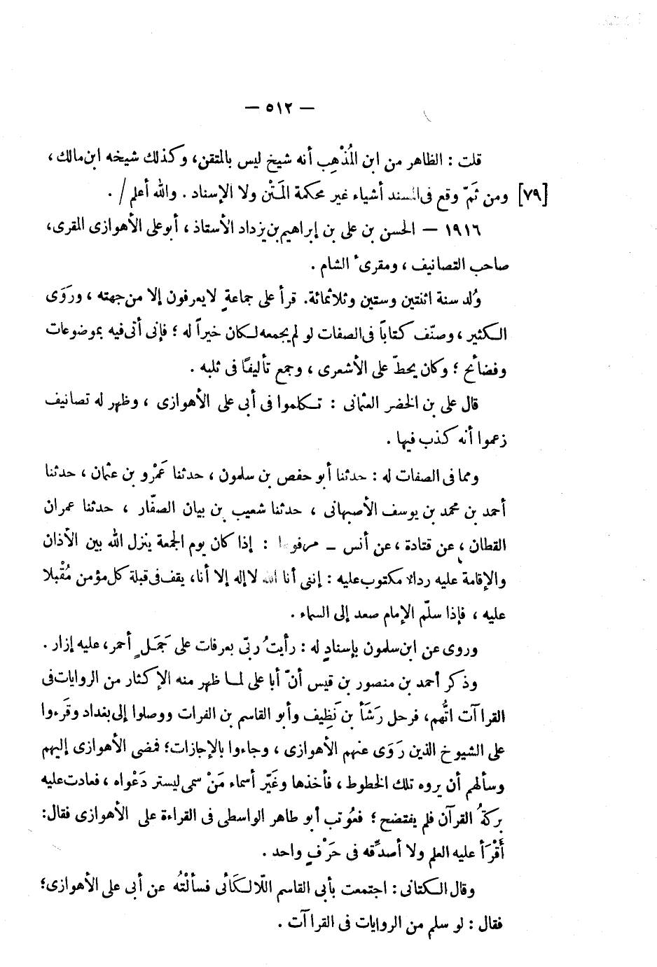 وقال الكتاني: اجتمعت بأبي القاسم اللالكائى فسألته عن أبي على الأهوازي، فقال: لو سلم من الروايات في القراآت.