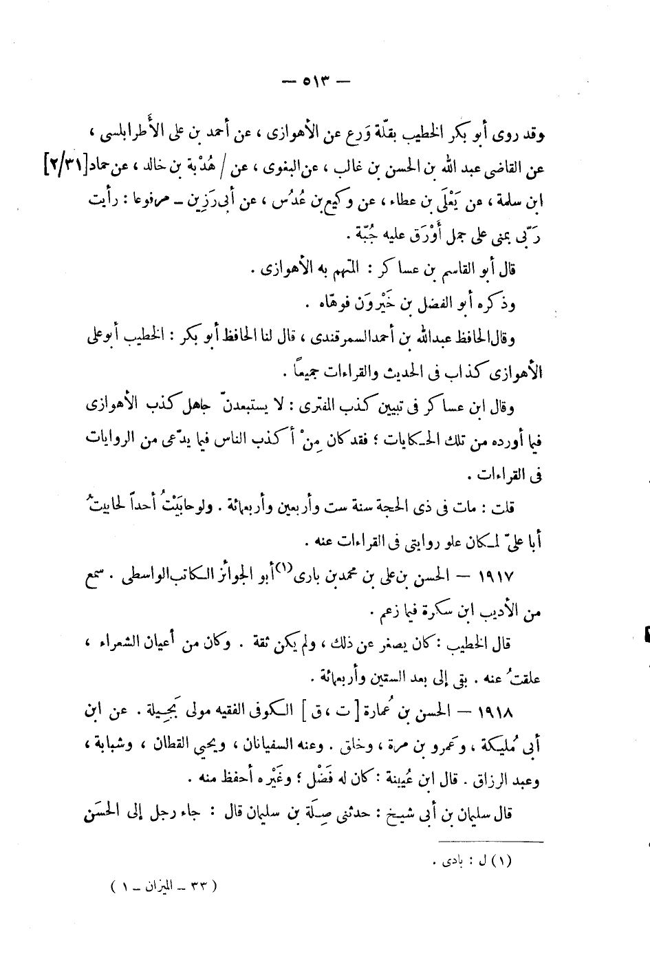 وقال الحافظ عبد الله بن أحمد السمرقندى، قال لنا الحافظ أبو بكر: الخطيب أبو على الأهوازي كذاب في الحديث والقراءات جميعا.