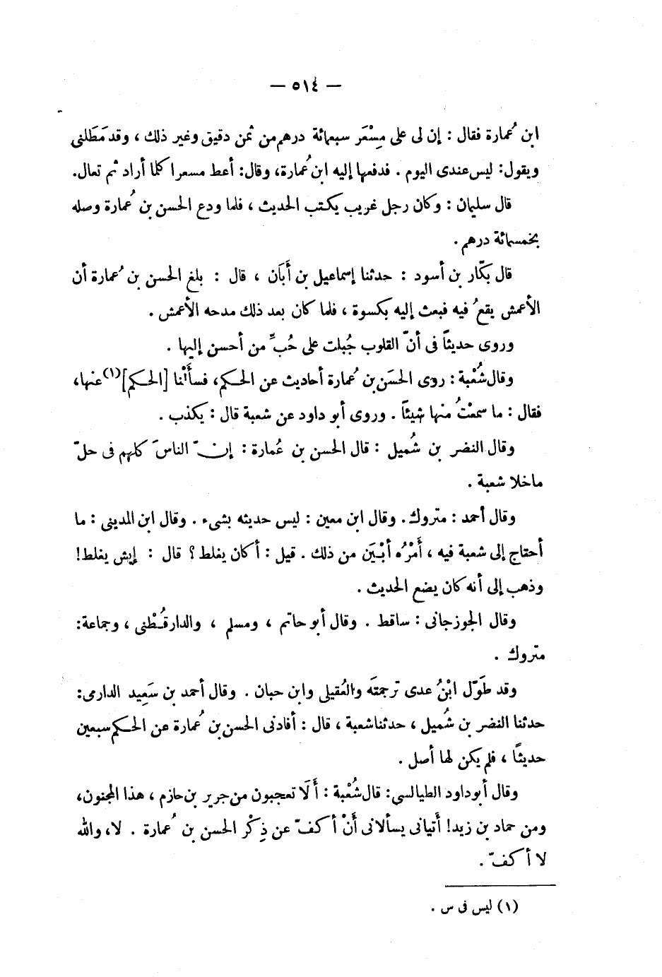 وقال النضر بن شميل: قال الحسن بن عمارة: أن الناس كلهم في حل ماخلا شعبة.