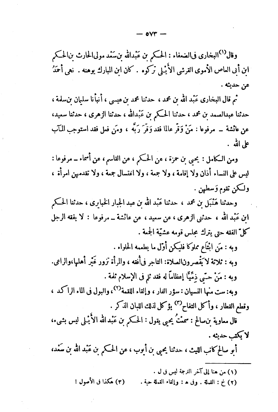 ثم قال البخاري عبد الله بن محمد، حدثنا محمد بن عيسى، أنبأنا سليمان بن سلمة، حدثنا عبد الصمد بن محمد، حدثنا الحكم بن عبد الله، حدثنا الزهري، حدثنا سعيد، عن عائشة - مرفوعاً: من وقر عالما فقد وقر ربه، ومن فعل فقد استوجب المآب على الله.