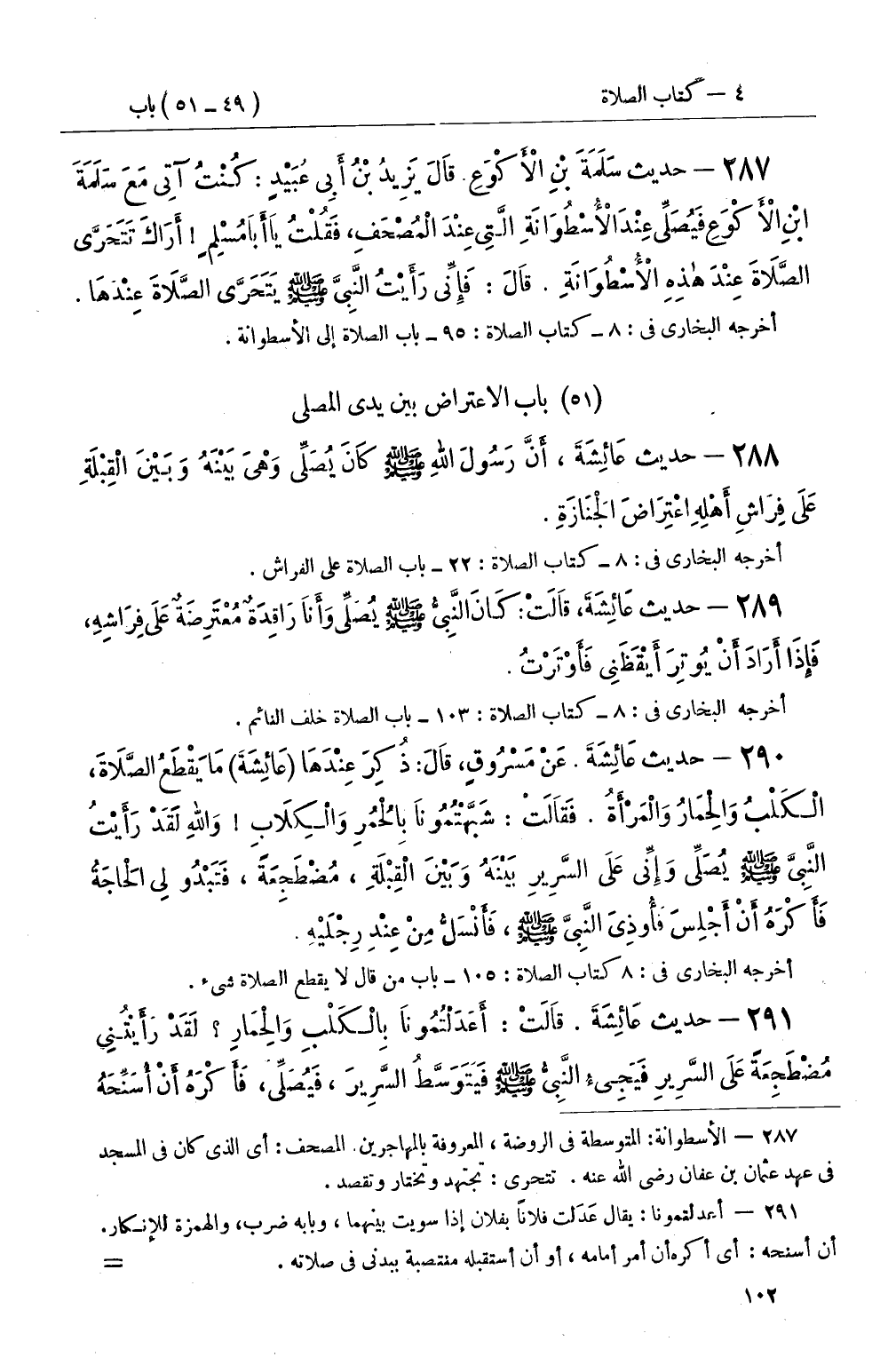 290 - حديث عَائِشَةَ عَنْ مَسْرُوقٍ، قَالَ: ذُكِرَ عِنْدَهَا (عَائِشَةَ) مَا يَقْطَعُ الصَّلاَةَ، الْكَلْبُ وَالْحِمَارُ وَالْمَرْأَةُ فَقَالَتْ: شَبَّهْتُمُونَا بالْحُمُر وَالْكِلاَب وَاللهِ لَقَدْ رَأَيْتُ النَّبِيَّ صَلَّى اللَّهُ عَلَيْهِ وَسَلَّمَ يُصَلِّي وَإِنِّي عَلَى السَرِيرِ بَيْنَهُ وَبَيْنَ الْقبْلَةِ، مُضْطَجِعَةً، فَتَبْدو لِي الْحَاجَةُ فَأَكْرَهُ أَنْ أَجْلِسَ فأُوذِيَ النَّبِيَّ صَلَّى اللَّهُ عَلَيْهِ وَسَلَّمَ، فَأَنْسَلُّ مِنْ عِنْد رِجْلَيْهِ