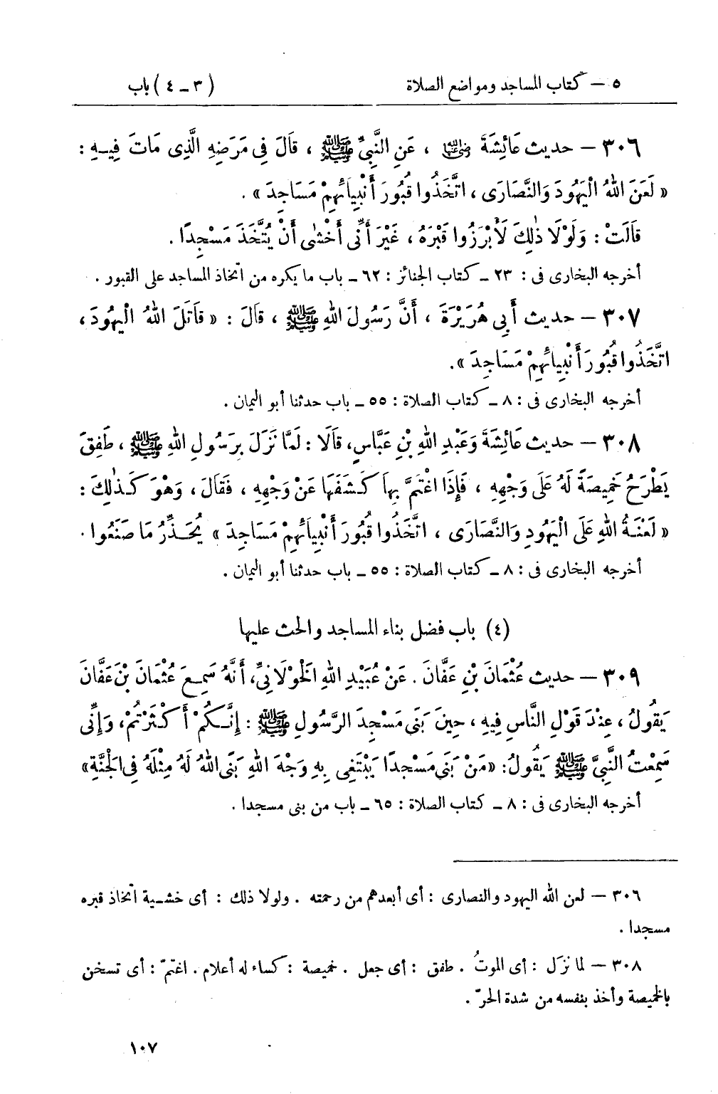 308 - حديث عَائِشَةَ وَعَبْدِ اللهِ بْنِ عَبَّاسٍ، قَالاَ: لَمَّا نَزَلَ برَسُولِ اللهِ صَلَّى اللَّهُ عَلَيْهِ وَسَلَّمَ، طَفِقَ يَطْرَحُ خَمِيصَةَ لَهُ عَلَى وَجْهِهِ، فَإِذَا اغْتَمَّ بهَا كَشَفَهَا عَنْ وَجْهِهِ، فَقَالَ، وَهُوَ كَذلِكَ: لَعْنَةُ اللهِ عَلَى الْيَهُودِ وَالنَّصَارَى، اتَّخَذُوا قُبُورَ أَنْبِيائِهِمْ مَسَاجِدَ يُحَذِّرُ مَا صَنَعُوا