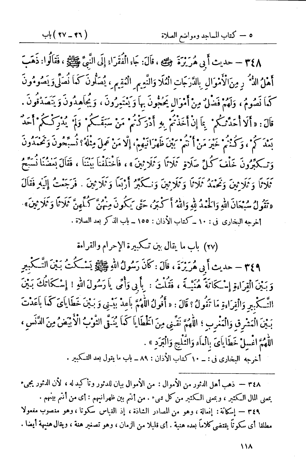 349 - حديث أَبِي هُرَيْرَةَ، قَالَ: كَانَ رَسُولُ اللهِ صَلَّى اللَّهُ عَلَيْهِ وَسَلَّمَ يَسْكُتُ بَيْنَ التَّكْبِيرِ وَبَيْنَ الْقِرَاءَةِ إِسْكَاتَةَ هُنَيَّةً، فَقُلْتُ: بِأَبِي وَأُمِّي يَا رَسُولَ اللهِ إِسْكَاتُكَ بَيْنَ التَّكْبِيرِ وَالْقِرَاءَةِ مَا تَقُولُ قَالَ: أَقُولُ: اللهُمَّ بَاعِدْ بَيْنِي وَبَيْنَ خَطَايَايَ كَمَا بَاعَدْتَ بَيْنَ الْمَشْرِقِ وَالْمَغْرِبِ؛ اللهُمَّ نقِّنِي مِنَ الْخَطَايَا كَمَا يُنَقَّى الثَوْبُ الأَبْيَضُ مِنَ الدَّنَسِ، اللهُمَّ اغْسِلْ خَطَايَايَ بِالْمَاءِ وَالثَلْجِ وَالْبَرَدِ